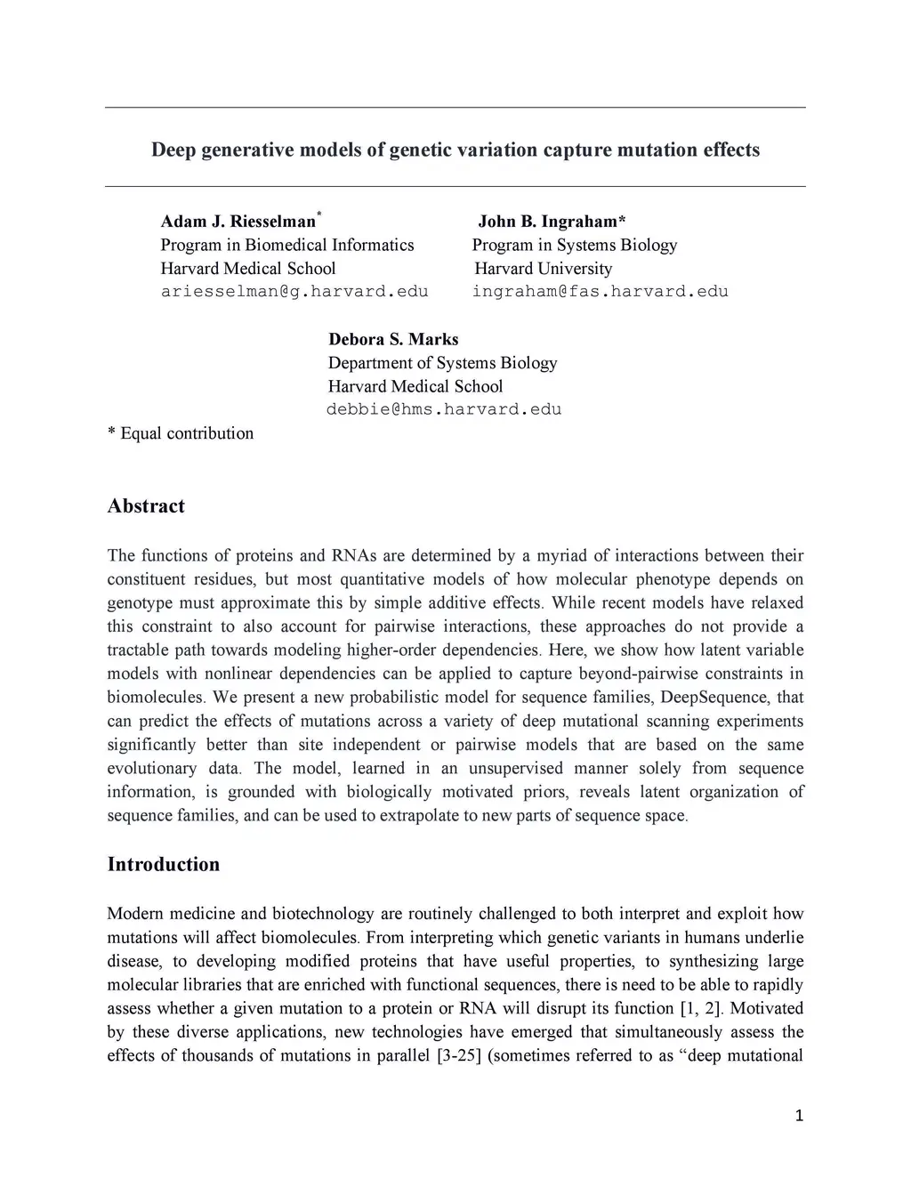 The functions of proteins and RNAs are determined by a myriad of interactions between their constituent residues, but most quantitative models of how molecular phenotype depends on genotype must approximate this by simple additive effects. While recent models have relaxed this constraint to also account for pairwise interactions, these approaches do not provide a tractable path towards modeling higher-order dependencies. Here, we show how latent variable models with nonlinear dependencies can be applied to capture beyond-pairwise constraints in biomolecules. We present a new probabilistic model for sequence families, DeepSequence, that can predict the effects of mutations across a variety of deep mutational scanning experiments significantly better than site independent or pairwise models that are based on the same evolutionary data. The model, learned in an unsupervised manner solely from sequence information, is grounded with biologically motivated priors, reveals latent organization of sequence families, and can be used to extrapolate to new parts of sequence space