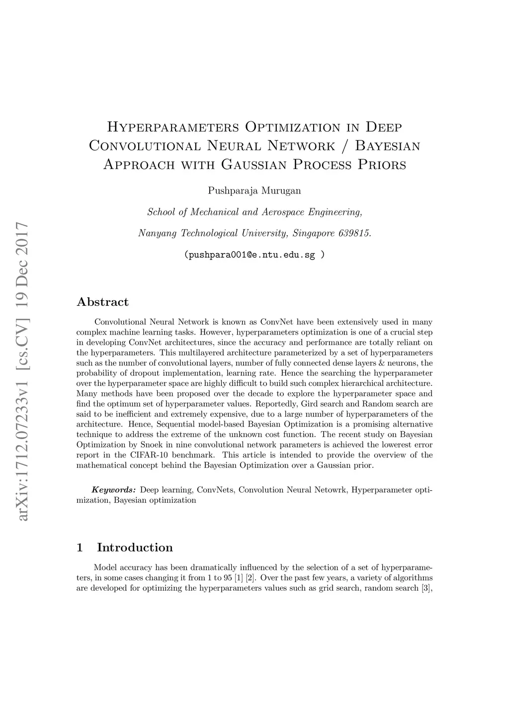 Convolutional Neural Network is known as ConvNet have been extensively used in many complex machine learning tasks. However, hyperparameters optimization is one of a crucial step in developing ConvNet architectures, since the accuracy and performance are reliant on the hyperparameters. This multilayered architecture parameterized by a set of hyperparameters such as the number of convolutional layers, number of fully connected dense layers & neurons, the probability of dropout implementation, learning rate. Hence the searching the hyperparameter over the hyperparameter space are highly difficult to build such complex hierarchical architecture. Many methods have been proposed over the decade to explore the hyperparameter space and find the optimum set of hyperparameter values. Reportedly, Gird search and Random search are said to be inefficient and extremely expensive, due to a large number of hyperparameters of the architecture. Hence, Sequential model-based Bayesian Optimization is a promising alternative technique to address the extreme of the unknown cost function. The recent study on Bayesian Optimization by Snoek in nine convolutional network parameters is achieved the lowerest error report in the CIFAR-10 benchmark. This article is intended to provide the overview of the mathematical concept behind the Bayesian Optimization over a Gaussian prior.