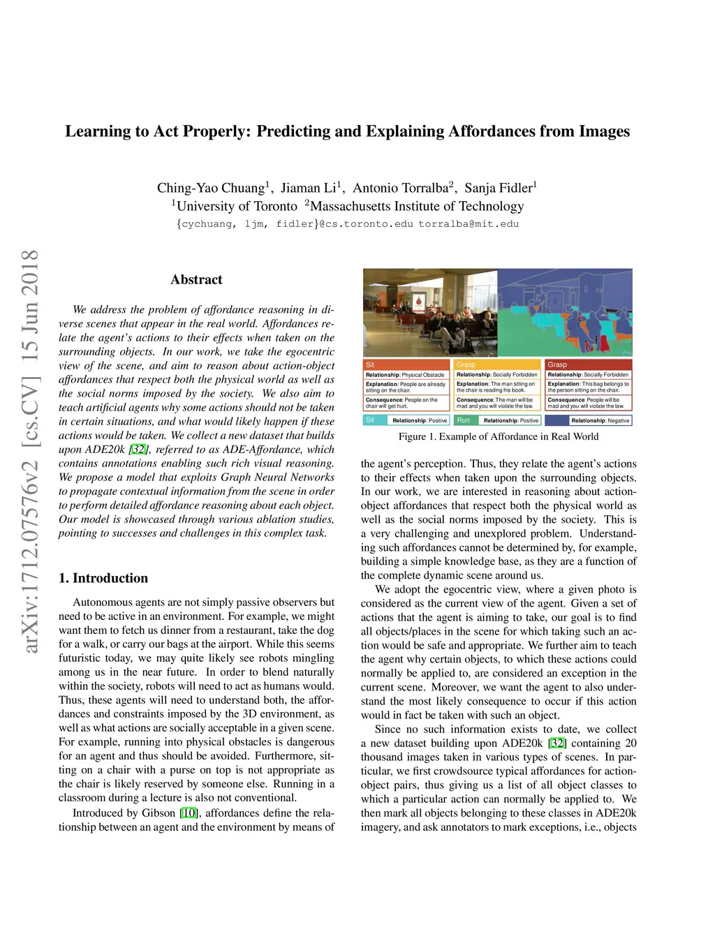 We address the problem of affordance reasoning in diverse scenes that appear in the real world. Affordances relate the agent's actions to their effects when taken on the surrounding objects. In our work, we take the egocentric view of the scene, and aim to reason about action-object affordances that respect both the physical world as well as the social norms imposed by the society. We also aim to teach artificial agents why some actions should not be taken in certain situations, and what would likely happen if these actions would be taken. We collect a new dataset that builds upon ADE20k, referred to as ADE-Affordance, which contains annotations enabling such rich visual reasoning. We propose a model that exploits Graph Neural Networks to propagate contextual information from the scene in order to perform detailed affordance reasoning about each object. Our model is showcased through various ablation studies, pointing to successes and challenges in this complex task.