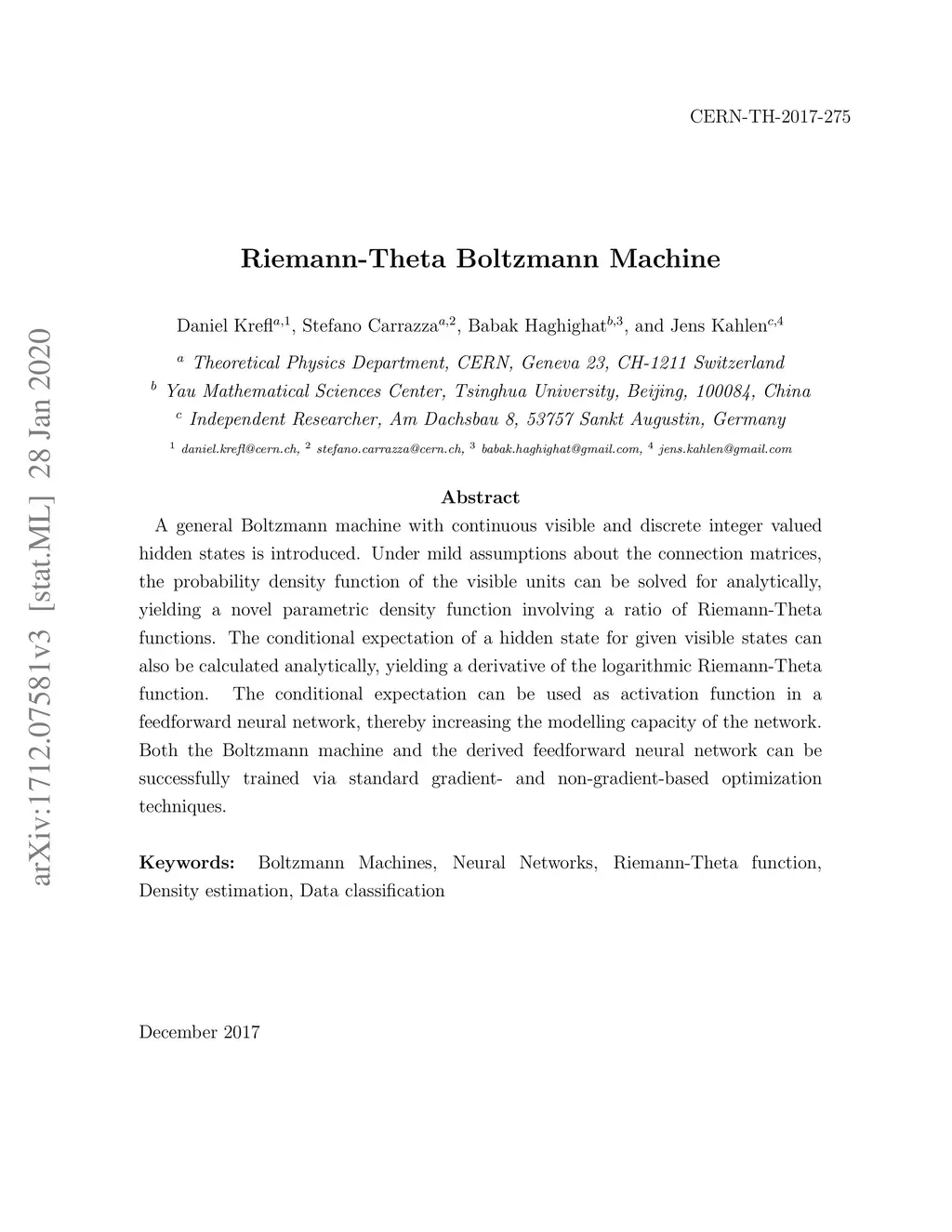A general Boltzmann machine with continuous visible and discrete integer valued hidden states is introduced. Under mild assumptions about the connection matrices, the probability density function of the visible units can be solved for analytically, yielding a novel parametric density function involving a ratio of Riemann-Theta functions. The conditional expectation of a hidden state for given visible states can also be calculated analytically, yielding a derivative of the logarithmic Riemann-Theta function. The conditional expectation can be used as activation function in a feedforward neural network, thereby increasing the modelling capacity of the network. Both the Boltzmann machine and the derived feedforward neural network can be successfully trained via standard gradient- and non-gradient-based optimization techniques.