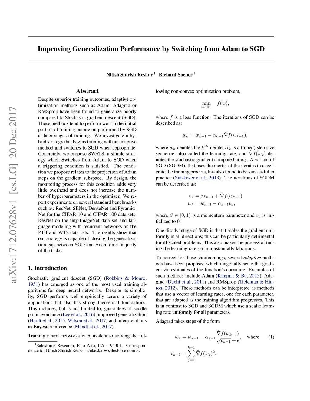 Improving Generalization Performance by Switching from Adam to SGD