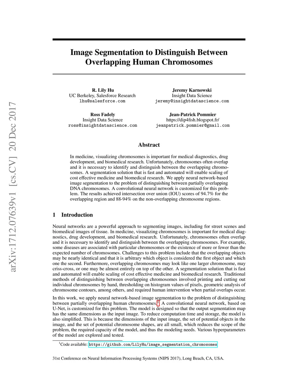 Image Segmentation to Distinguish Between Overlapping Human Chromosomes