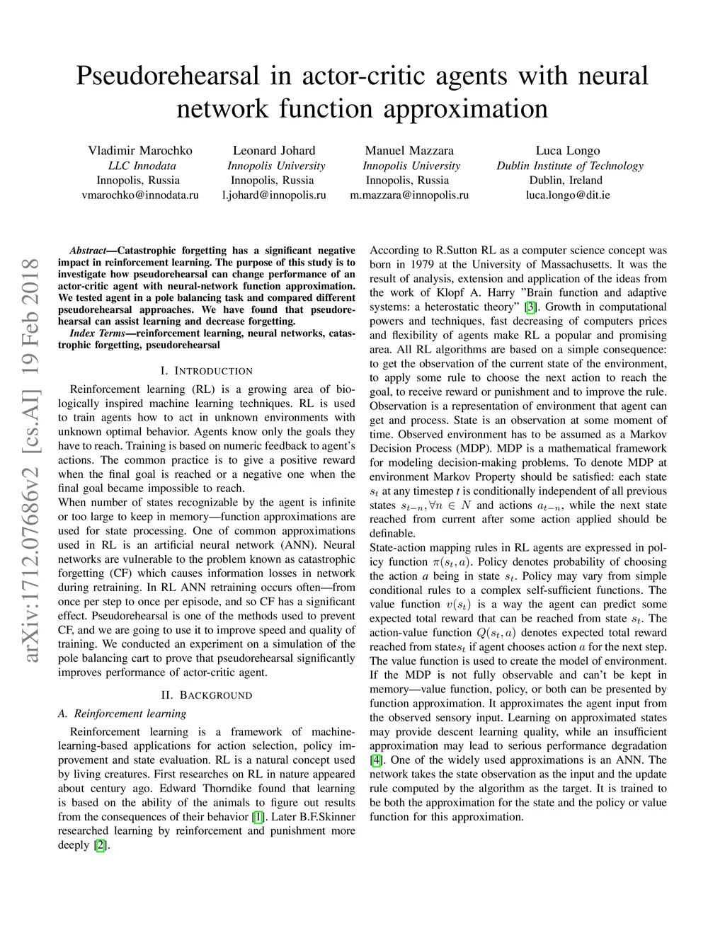 Catastrophic forgetting has a significant negative impact in reinforcement learning. The purpose of this study is to investigate how pseudorehearsal can change performance of an actor-critic agent with neural-network function approximation. We tested agent in a pole balancing task and compared different pseudorehearsal approaches. We have found that pseudorehearsal can assist learning and decrease forgetting.