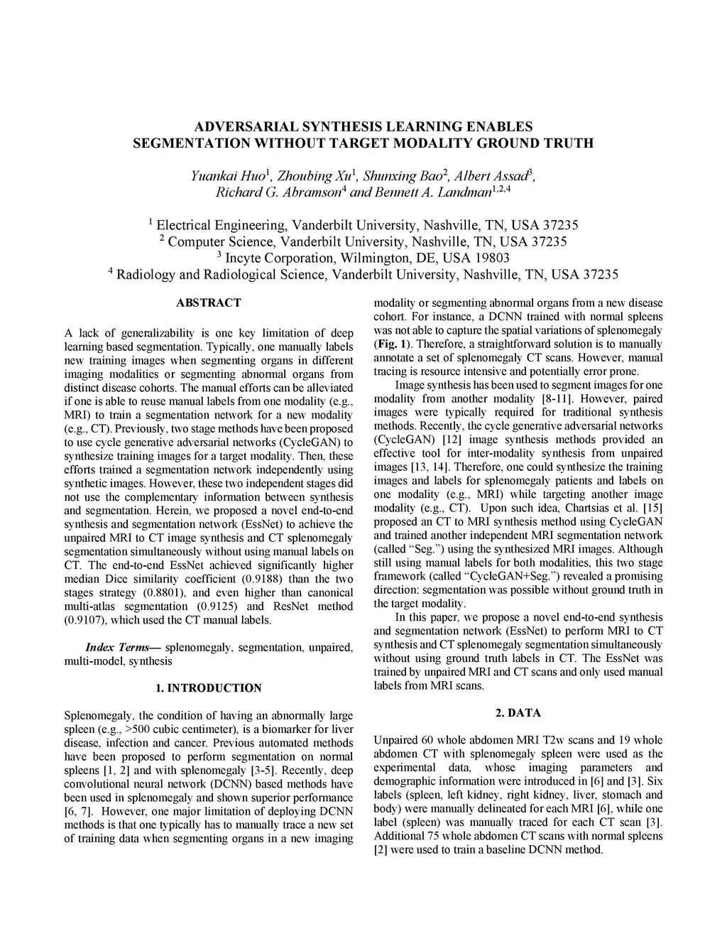 A lack of generalizability is one key limitation of deep learning based segmentation. Typically, one manually labels new training images when segmenting organs in different imaging modalities or segmenting abnormal organs from distinct disease cohorts. The manual efforts can be alleviated if one is able to reuse manual labels from one modality (e.g., MRI) to train a segmentation network for a new modality (e.g., CT). Previously, two stage methods have been proposed to use cycle generative adversarial networks (CycleGAN) to synthesize training images for a target modality. Then, these efforts trained a segmentation network independently using synthetic images. However, these two independent stages did not use the complementary information between synthesis and segmentation. Herein, we proposed a novel end-to-end synthesis and segmentation network (EssNet) to achieve the unpaired MRI to CT image synthesis and CT splenomegaly segmentation simultaneously without using manual labels on CT. The end-to-end EssNet achieved significantly higher median Dice similarity coefficient (0.9188) than the two stages strategy (0.8801), and even higher than canonical multi-atlas segmentation (0.9125) and ResNet method (0.9107), which used the CT manual labels.