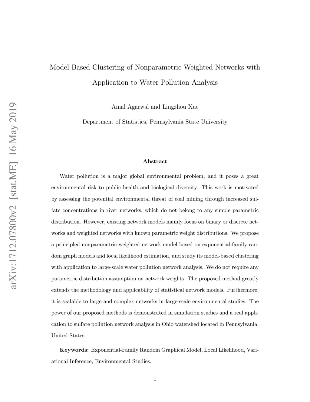 Water pollution is a major global environmental problem, and it poses a great environmental risk to public health and biological diversity. This work is motivated by assessing the potential environmental threat of coal mining through increased sulfate concentrations in river networks, which do not belong to any simple parametric distribution. However, existing network models mainly focus on binary or discrete networks and weighted networks with known parametric weight distributions. We propose a principled nonparametric weighted network model based on exponential-family random graph models and local likelihood estimation and study its model-based clustering with application to large-scale water pollution network analysis. We do not require any parametric distribution assumption on network weights. The proposed method greatly extends the methodology and applicability of statistical network models. Furthermore, it is scalable to large and complex networks in large-scale environmental studies. The power of our proposed methods is demonstrated in simulation studies and a real application to sulfate pollution network analysis in Ohio watershed located in Pennsylvania, United States.