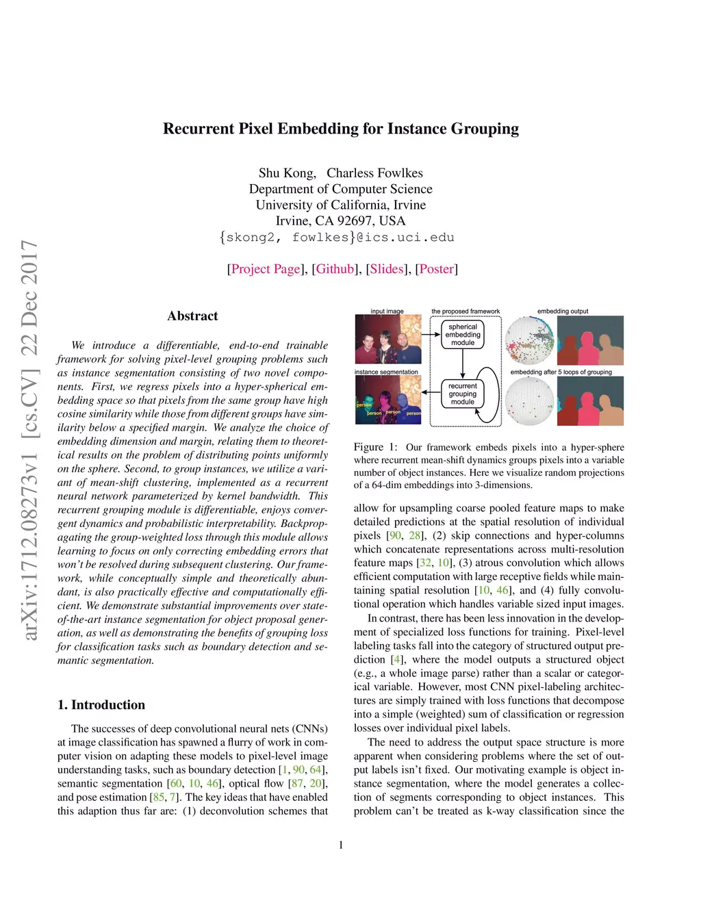 We introduce a differentiable, end-to-end trainable framework for solving pixel-level grouping problems such as instance segmentation consisting of two novel components. First, we regress pixels into a hyper-spherical embedding space so that pixels from the same group have high cosine similarity while those from different groups have similarity below a specified margin. We analyze the choice of embedding dimension and margin, relating them to theoretical results on the problem of distributing points uniformly on the sphere. Second, to group instances, we utilize a variant of mean-shift clustering, implemented as a recurrent neural network parameterized by kernel bandwidth. This recurrent grouping module is differentiable, enjoys convergent dynamics and probabilistic interpretability. Backpropagating the group-weighted loss through this module allows learning to focus on only correcting embedding errors that won't be resolved during subsequent clustering. Our framework, while conceptually simple and theoretically abundant, is also practically effective and computationally efficient. We demonstrate substantial improvements over state-of-the-art instance segmentation for object proposal generation, as well as demonstrating the benefits of grouping loss for classification tasks such as boundary detection and semantic segmentation.