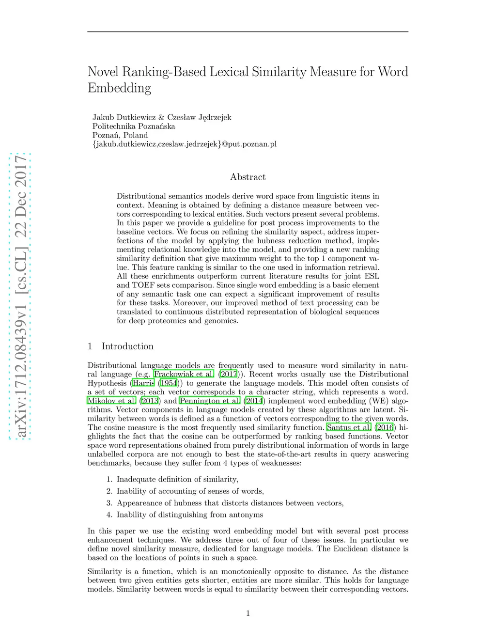 Distributional semantics models derive word space from linguistic items in context. Meaning is obtained by defining a distance measure between vectors corresponding to lexical entities. Such vectors present several problems. In this paper we provide a guideline for post process improvements to the baseline vectors. We focus on refining the similarity aspect, address imperfections of the model by applying the hubness reduction method, implementing relational knowledge into the model, and providing a new ranking similarity definition that give maximum weight to the top 1 component value. This feature ranking is similar to the one used in information retrieval. All these enrichments outperform current literature results for joint ESL and TOEF sets comparison. Since single word embedding is a basic element of any semantic task one can expect a significant improvement of results for these tasks. Moreover, our improved method of text processing can be translated to continuous distributed representation of biological sequences for deep proteomics and genomics.