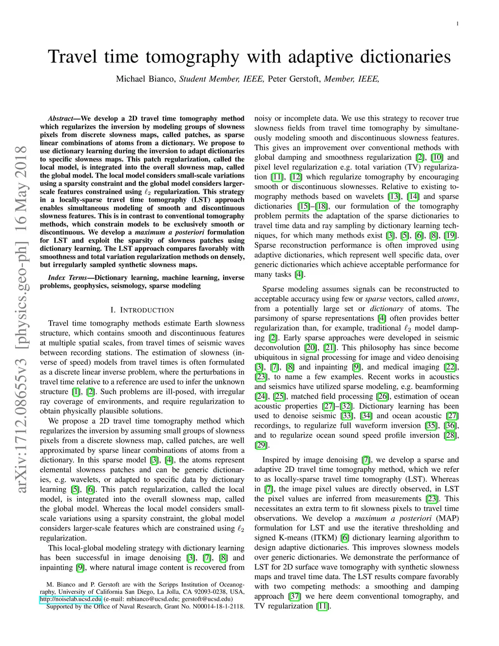 We develop a 2D travel time tomography method which regularizes the inversion by modeling groups of slowness pixels from discrete slowness maps, called patches, as sparse linear combinations of atoms from a dictionary. We propose to use dictionary learning during the inversion to adapt dictionaries to specific slowness maps. This patch regularization, called the local model, is integrated into the overall slowness map, called the global model. The local model considers small-scale variations using a sparsity constraint and the global model considers larger-scale features constrained using regularization. This strategy in a locally-sparse travel time tomography (LST) approach enables simultaneous modeling of smooth and discontinuous slowness features. This is in contrast to conventional tomography methods, which constrain models to be exclusively smooth or discontinuous. We develop a formulation for LST and exploit the sparsity of slowness patches using dictionary learning. The LST approach compares favorably with smoothness and total variation regularization methods on densely, but irregularly sampled synthetic slowness maps.
