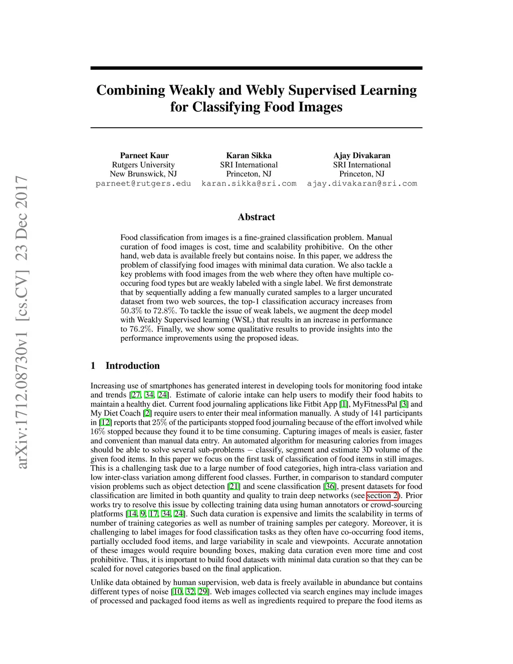 Combining Weakly and Webly Supervised Learning for Classifying Food