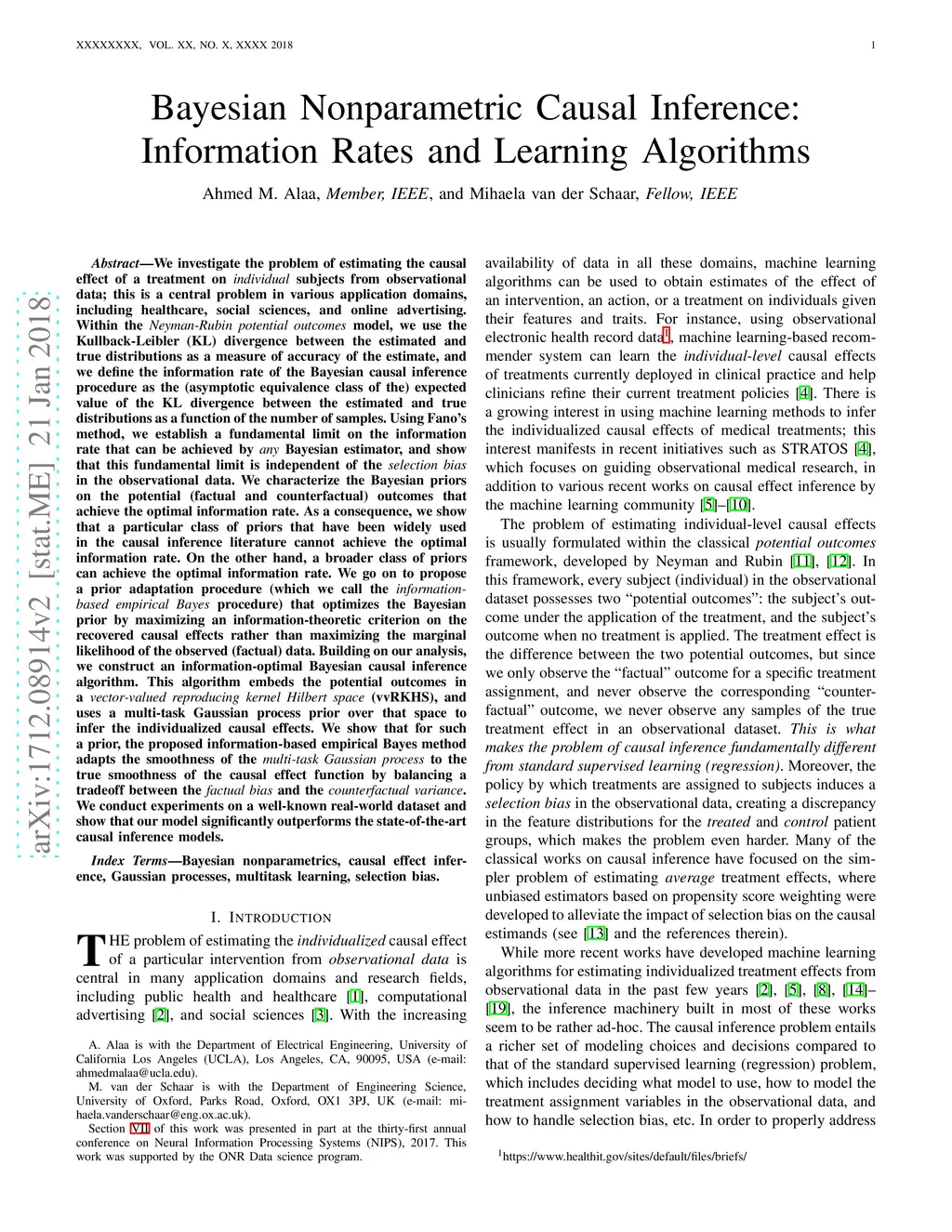 We investigate the problem of estimating the causal effect of a treatment on individual subjects from observational data, this is a central problem in various application domains, including healthcare, social sciences, and online advertising. Within the Neyman Rubin potential outcomes model, we use the Kullback Leibler (KL) divergence between the estimated and true distributions as a measure of accuracy of the estimate, and we define the information rate of the Bayesian causal inference procedure as the (asymptotic equivalence class of the) expected value of the KL divergence between the estimated and true distributions as a function of the number of samples. Using Fano method, we establish a fundamental limit on the information rate that can be achieved by any Bayesian estimator, and show that this fundamental limit is independent of the selection bias in the observational data. We characterize the Bayesian priors on the potential (factual and counterfactual) outcomes that achieve the optimal information rate. As a consequence, we show that a particular class of priors that have been widely used in the causal inference literature cannot achieve the optimal information rate. On the other hand, a broader class of priors can achieve the optimal information rate. We go on to propose a prior adaptation procedure (which we call the information based empirical Bayes procedure) that optimizes the Bayesian prior by maximizing an information theoretic criterion on the recovered causal effects rather than maximizing the marginal likelihood of the observed (factual) data. Building on our analysis, we construct an information optimal Bayesian causal inference algorithm.