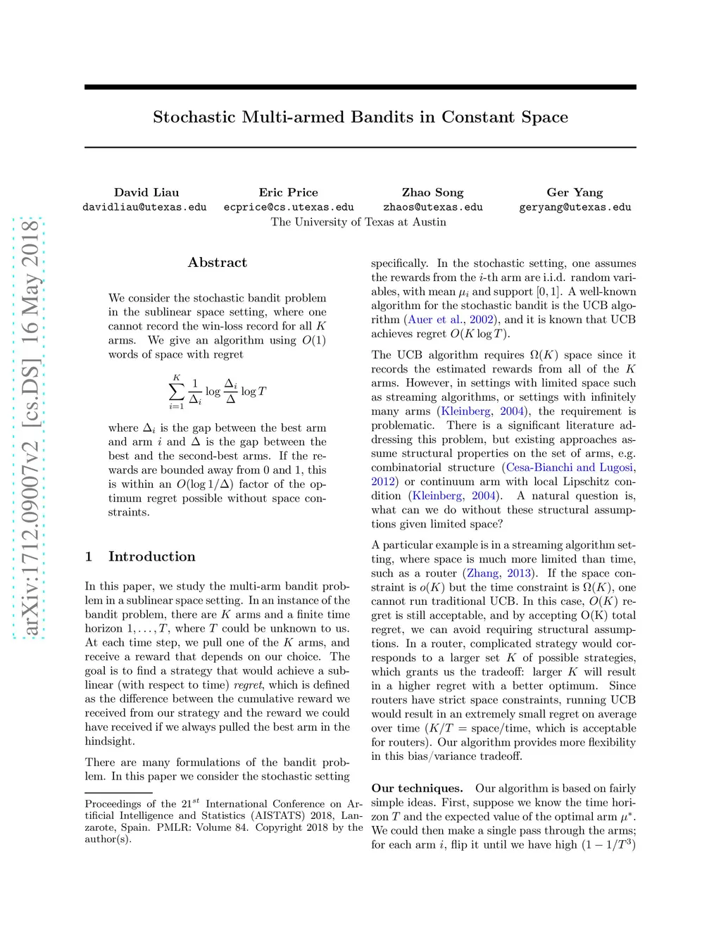 We consider the stochastic bandit problem in the sublinear space setting, where one cannot record the win-loss record for all arms. We give an algorithm using words of space with regret \[ \sum_{i=1}^{K}\frac{1}{\Delta_i}\log \frac{\Delta_i}{\Delta}\log T \] where is the gap between the best arm and arm and is the gap between the best and the second-best arms. If the rewards are bounded away from and , this is within an factor of the optimum regret possible without space constraints.