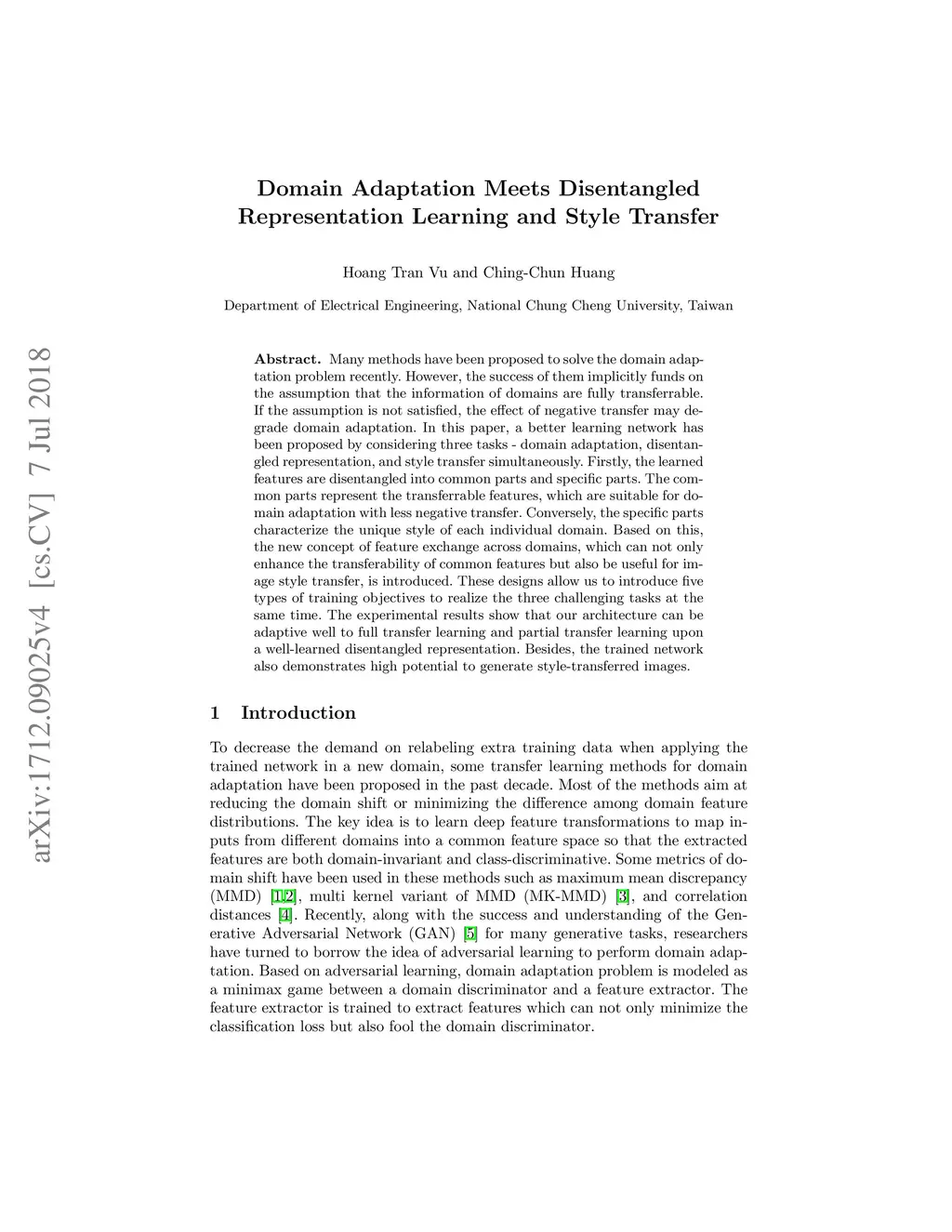 Many methods have been proposed to solve the domain adaptation problem recently. However, the success of them implicitly funds on the assumption that the information of domains are fully transferrable. If the assumption is not satisfied, the effect of negative transfer may degrade domain adaptation. In this paper, a better learning network has been proposed by considering three tasks - domain adaptation, disentangled representation, and style transfer simultaneously. Firstly, the learned features are disentangled into common parts and specific parts. The common parts represent the transferrable features, which are suitable for domain adaptation with less negative transfer. Conversely, the specific parts characterize the unique style of each individual domain. Based on this, the new concept of feature exchange across domains, which can not only enhance the transferability of common features but also be useful for image style transfer, is introduced. These designs allow us to introduce five types of training objectives to realize the three challenging tasks at the same time. The experimental results show that our architecture can be adaptive well to full transfer learning and partial transfer learning upon a well-learned disentangled representation. Besides, the trained network also demonstrates high potential to generate style-transferred images.