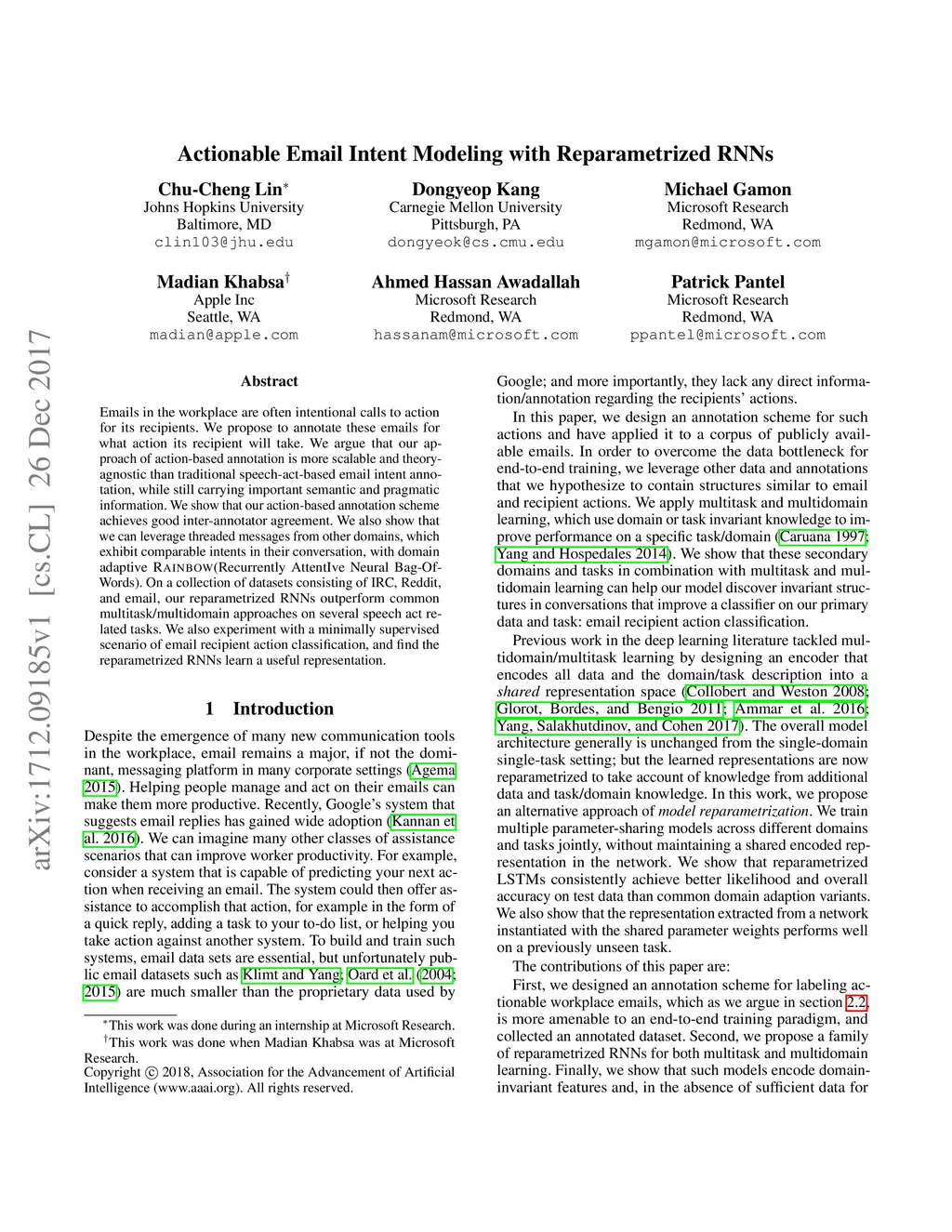 Actionable Email Intent Modeling with Reparametrized RNNs