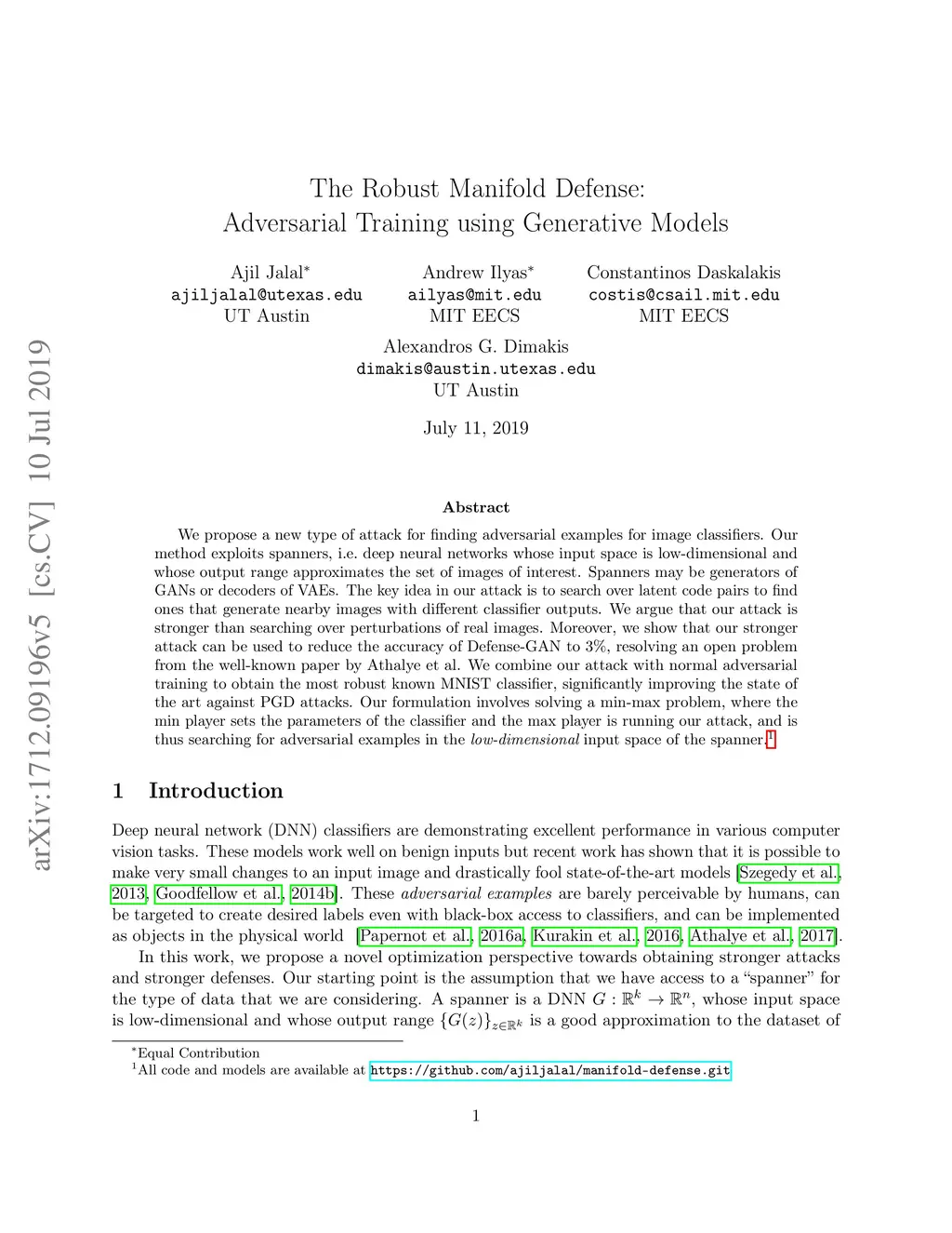 We propose a new type of attack for finding adversarial examples for image classifiers. Our method exploits spanners, i.e. deep neural networks whose input space is low-dimensional and whose output range approximates the set of images of interest. Spanners may be generators of GANs or decoders of VAEs. The key idea in our attack is to search over latent code pairs to find ones that generate nearby images with different classifier outputs. We argue that our attack is stronger than searching over perturbations of real images. Moreover, we show that our stronger attack can be used to reduce the accuracy of Defense-GAN to 3\%, resolving an open problem from the well-known paper by Athalye et al. We combine our attack with normal adversarial training to obtain the most robust known MNIST classifier, significantly improving the state of the art against PGD attacks. Our formulation involves solving a min-max problem, where the min player sets the parameters of the classifier and the max player is running our attack, and is thus searching for adversarial examples in the {\em low-dimensional} input space of the spanner. All code and models are available at \url{https://github.com/ajiljalal/manifold-defense.git}