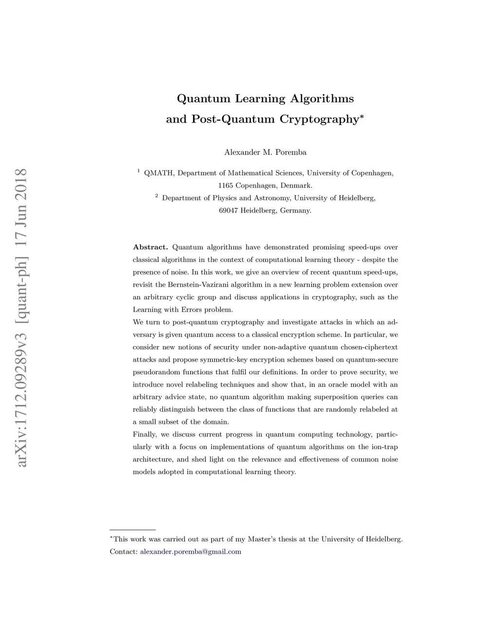 Quantum algorithms have demonstrated promising speed-ups over classical algorithms in the context of computational learning theory - despite the presence of noise. In this work, we give an overview of recent quantum speed-ups, revisit the Bernstein-Vazirani algorithm in a new learning problem extension over an arbitrary cyclic group and discuss applications in cryptography, such as the Learning with Errors problem. We turn to post-quantum cryptography and investigate attacks in which an adversary is given quantum access to a classical encryption scheme. In particular, we consider new notions of security under non-adaptive quantum chosen-ciphertext attacks and propose symmetric-key encryption schemes based on quantum-secure pseudorandom functions that fulfil our definitions. In order to prove security, we introduce novel relabeling techniques and show that, in an oracle model with an arbitrary advice state, no quantum algorithm making superposition queries can reliably distinguish between the class of functions that are randomly relabeled at a small subset of the domain. Finally, we discuss current progress in quantum computing technology, particularly with a focus on implementations of quantum algorithms on the ion-trap architecture, and shed light on the relevance and effectiveness of common noise models adopted in computational learning theory.
