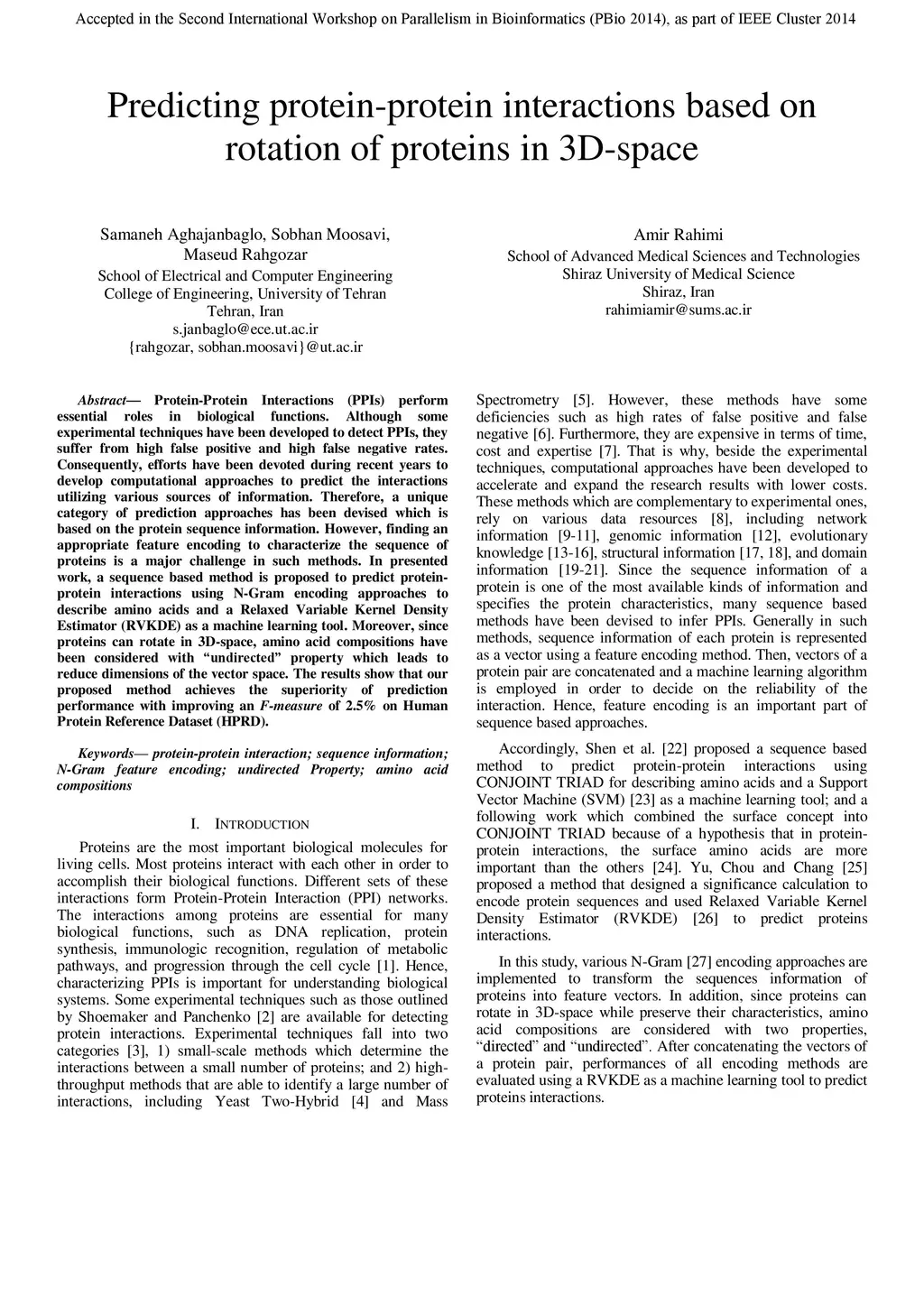 Protein-Protein Interactions (PPIs) perform essential roles in biological functions. Although some experimental techniques have been developed to detect PPIs, they suffer from high false positive and high false negative rates. Consequently, efforts have been devoted during recent years to develop computational approaches to predict the interactions utilizing various sources of information. Therefore, a unique category of prediction approaches has been devised which is based on the protein sequence information. However, finding an appropriate feature encoding to characterize the sequence of proteins is a major challenge in such methods. In presented work, a sequence based method is proposed to predict protein-protein interactions using N-Gram encoding approaches to describe amino acids and a Relaxed Variable Kernel Density Estimator (RVKDE) as a machine learning tool. Moreover, since proteins can rotate in 3D-space, amino acid compositions have been considered with "undirected" property which leads to reduce dimensions of the vector space. The results show that our proposed method achieves the superiority of prediction performance with improving an F-measure of 2.5% on Human Protein Reference Dataset (HPRD).