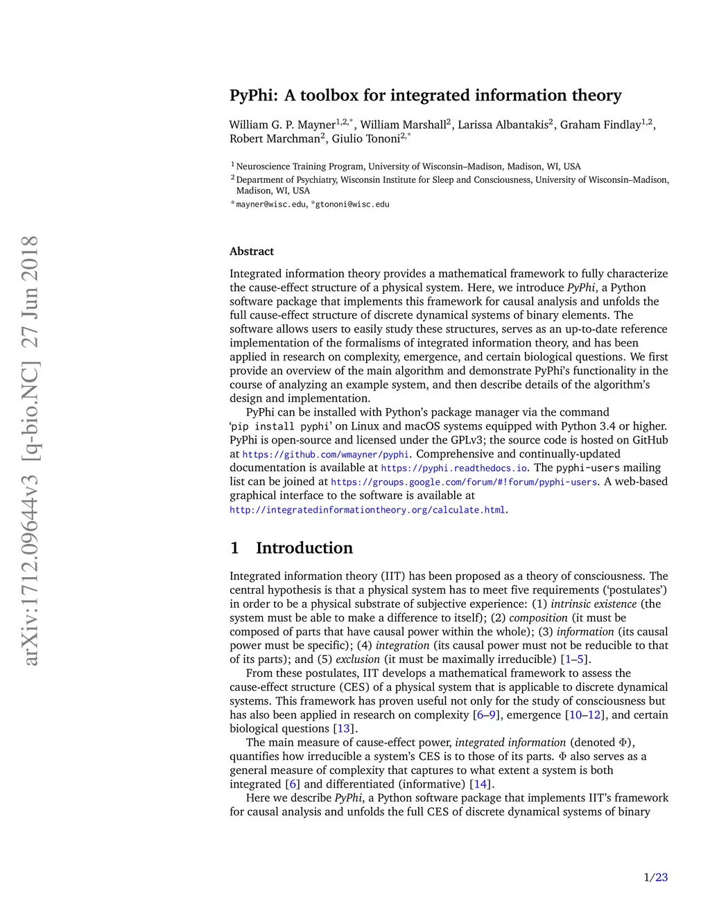 Integrated information theory provides a mathematical framework to fully characterize the cause-effect structure of a physical system. Here, we introduce PyPhi, a Python software package that implements this framework for causal analysis and unfolds the full cause-effect structure of discrete dynamical systems of binary elements. The software allows users to easily study these structures, serves as an up-to-date reference implementation of the formalisms of integrated information theory, and has been applied in research on complexity, emergence, and certain biological questions. We first provide an overview of the main algorithm and demonstrate PyPhi's functionality in the course of analyzing an example system, and then describe details of the algorithm's design and implementation. PyPhi can be installed with Python's package manager via the command 'pip install pyphi' on Linux and macOS systems equipped with Python 3.4 or higher. PyPhi is open-source and licensed under the GPLv3; the source code is hosted on GitHub at https://github.com/wmayner/pyphi . Comprehensive and continually-updated documentation is available at https://pyphi.readthedocs.io/ . The pyphi-users mailing list can be joined at https://groups.google.com/forum/#!forum/pyphi-users . A web-based graphical interface to the software is available at http://integratedinformationtheory.org/calculate.html .