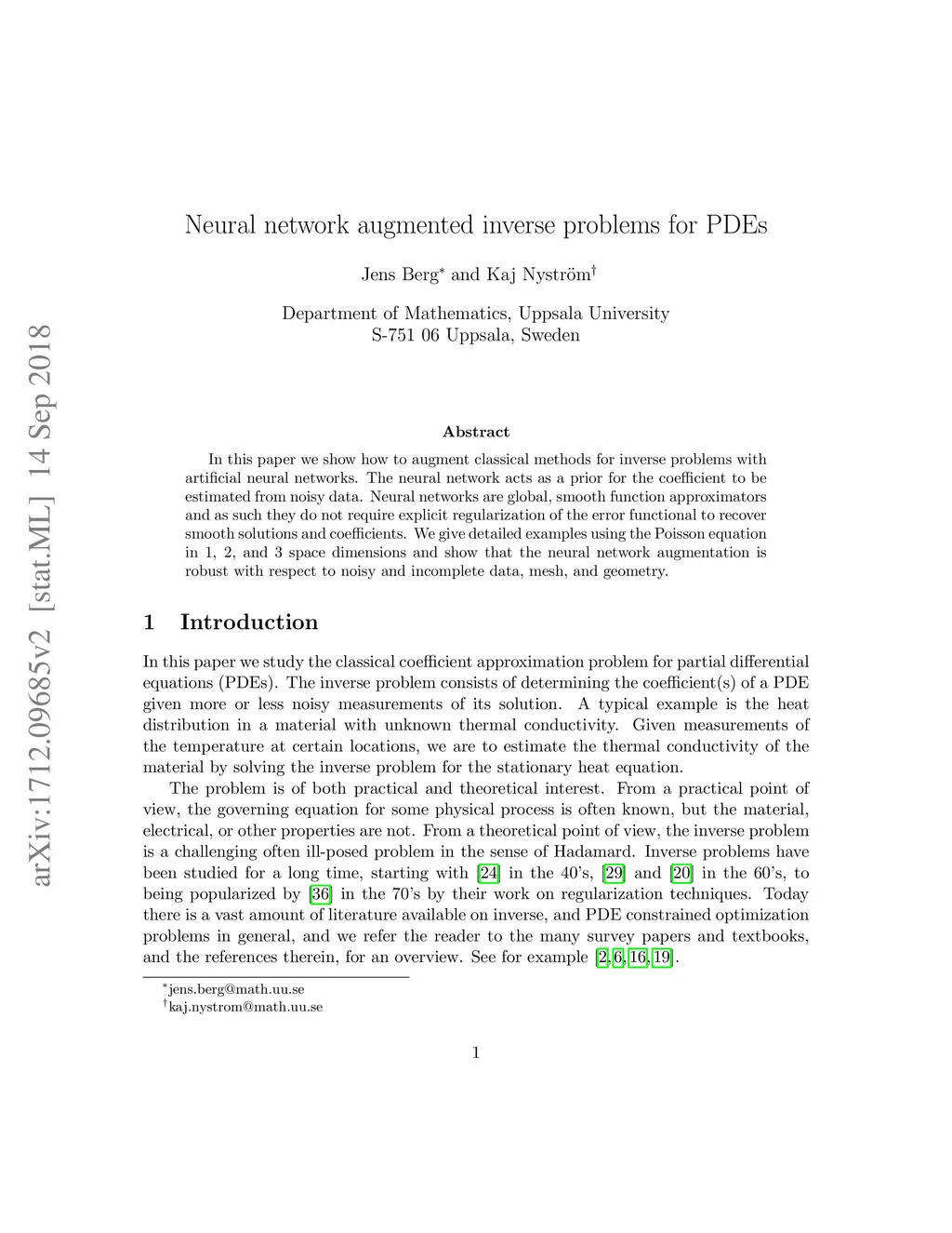 In this paper we show how to augment classical methods for inverse problems with artificial neural networks. The neural network acts as a prior for the coefficient to be estimated from noisy data. Neural networks are global, smooth function approximators and as such they do not require explicit regularization of the error functional to recover smooth solutions and coefficients. We give detailed examples using the Poisson equation in 1, 2, and 3 space dimensions and show that the neural network augmentation is robust with respect to noisy and incomplete data, mesh, and geometry.