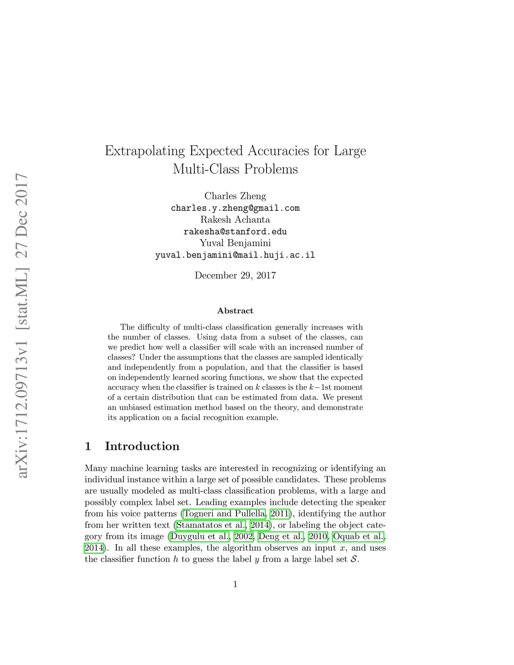 The difficulty of multi-class classification generally increases with the number of classes. Using data from a subset of the classes, can we predict how well a classifier will scale with an increased number of classes? Under the assumptions that the classes are sampled identically and independently from a population, and that the classifier is based on independently learned scoring functions, we show that the expected accuracy when the classifier is trained on k classes is the (k-1)st moment of a certain distribution that can be estimated from data. We present an unbiased estimation method based on the theory, and demonstrate its application on a facial recognition example.