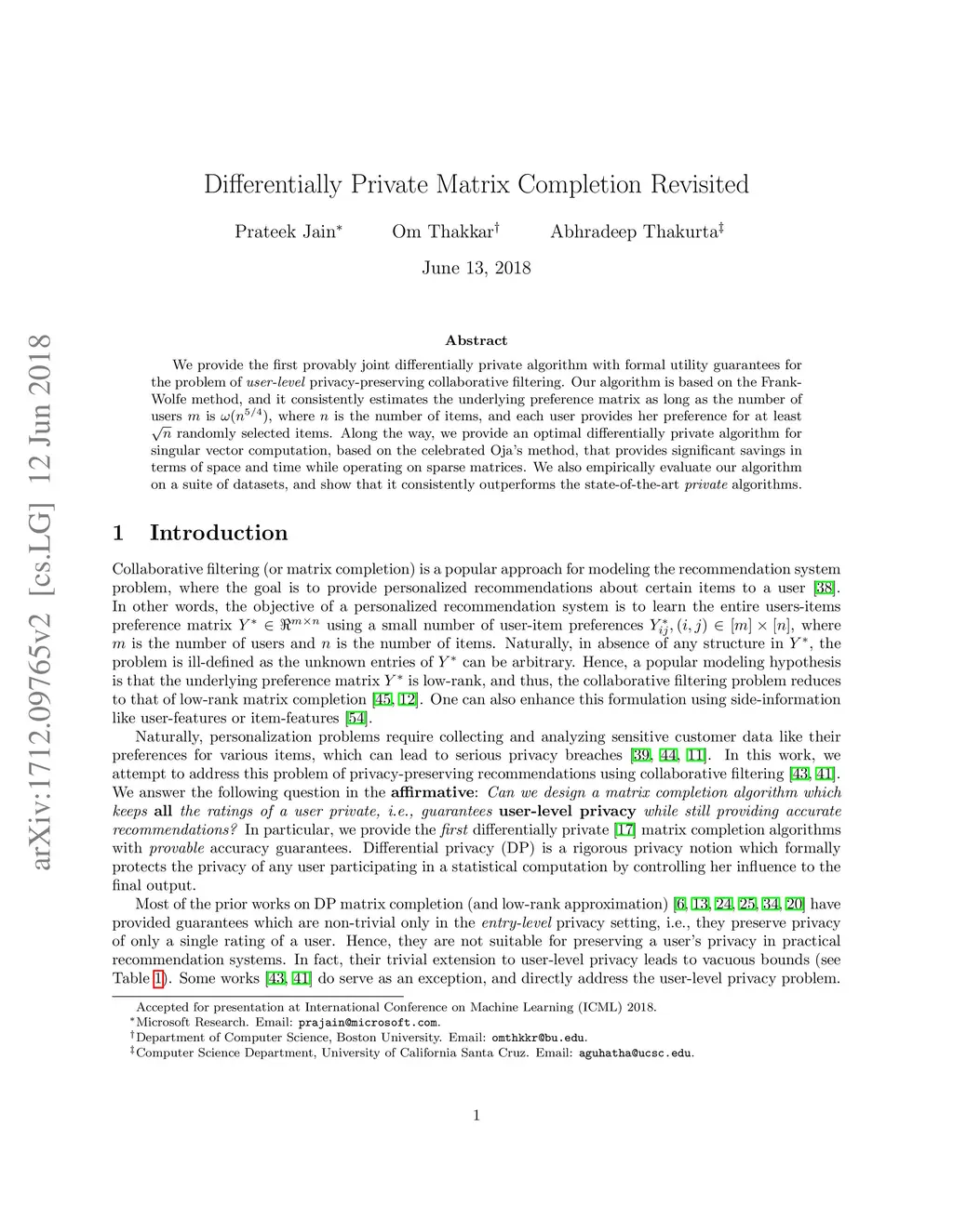 We provide the first provably joint differentially private algorithm with formal utility guarantees for the problem of user-level privacy-preserving collaborative filtering. Our algorithm is based on the Frank-Wolfe method, and it consistently estimates the underlying preference matrix as long as the number of users is , where is the number of items, and each user provides her preference for at least randomly selected items. Along the way, we provide an optimal differentially private algorithm for singular vector computation, based on the celebrated Oja's method, that provides significant savings in terms of space and time while operating on sparse matrices. We also empirically evaluate our algorithm on a suite of datasets, and show that it consistently outperforms the state-of-the-art private algorithms.