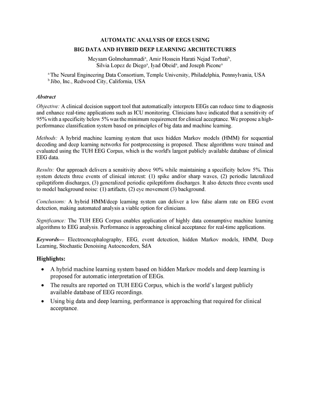 Objective: A clinical decision support tool that automatically interprets EEGs can reduce time to diagnosis and enhance real-time applications such as ICU monitoring. Clinicians have indicated that a sensitivity of 95% with a specificity below 5% was the minimum requirement for clinical acceptance. We propose a highperformance classification system based on principles of big data and machine learning. Methods: A hybrid machine learning system that uses hidden Markov models (HMM) for sequential decoding and deep learning networks for postprocessing is proposed. These algorithms were trained and evaluated using the TUH EEG Corpus, which is the world's largest publicly available database of clinical EEG data. Results: Our approach delivers a sensitivity above 90% while maintaining a specificity below 5%. This system detects three events of clinical interest: (1) spike and/or sharp waves, (2) periodic lateralized epileptiform discharges, (3) generalized periodic epileptiform discharges. It also detects three events used to model background noise: (1) artifacts, (2) eye movement (3) background. Conclusions: A hybrid HMM/deep learning system can deliver a low false alarm rate on EEG event detection, making automated analysis a viable option for clinicians. Significance: The TUH EEG Corpus enables application of highly data consumptive machine learning algorithms to EEG analysis. Performance is approaching clinical acceptance for real-time applications.