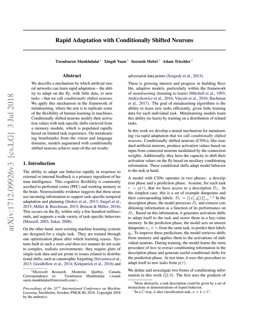 We describe a mechanism by which artificial neural networks can learn rapid adaptation - the ability to adapt on the fly, with little data, to new tasks - that we call conditionally shifted neurons. We apply this mechanism in the framework of metalearning, where the aim is to replicate some of the flexibility of human learning in machines. Conditionally shifted neurons modify their activation values with task-specific shifts retrieved from a memory module, which is populated rapidly based on limited task experience. On metalearning benchmarks from the vision and language domains, models augmented with conditionally shifted neurons achieve state-of-the-art results.