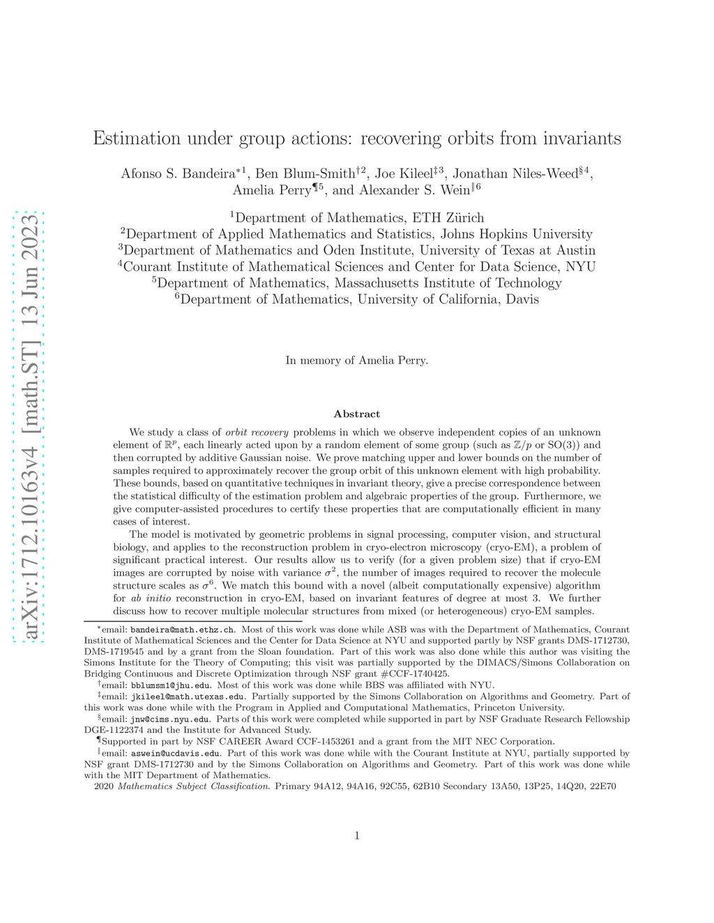 We study a class of orbit recovery problems in which we observe independent copies of an unknown element of , each linearly acted upon by a random element of some group (such as or ) and then corrupted by additive Gaussian noise. We prove matching upper and lower bounds on the number of samples required to approximately recover the group orbit of this unknown element with high probability. These bounds, based on quantitative techniques in invariant theory, give a precise correspondence between the statistical difficulty of the estimation problem and algebraic properties of the group. Furthermore, we give computer-assisted procedures to certify these properties that are computationally efficient in many cases of interest. The model is motivated by geometric problems in signal processing, computer vision, and structural biology, and applies to the reconstruction problem in cryo-electron microscopy (cryo-EM), a problem of significant practical interest. Our results allow us to verify (for a given problem size) that if cryo-EM images are corrupted by noise with variance , the number of images required to recover the molecule structure scales as . We match this bound with a novel (albeit computationally expensive) algorithm for ab initio reconstruction in cryo-EM, based on invariant features of degree at most 3. We further discuss how to recover multiple molecular structures from mixed (or heterogeneous) cryo-EM samples.