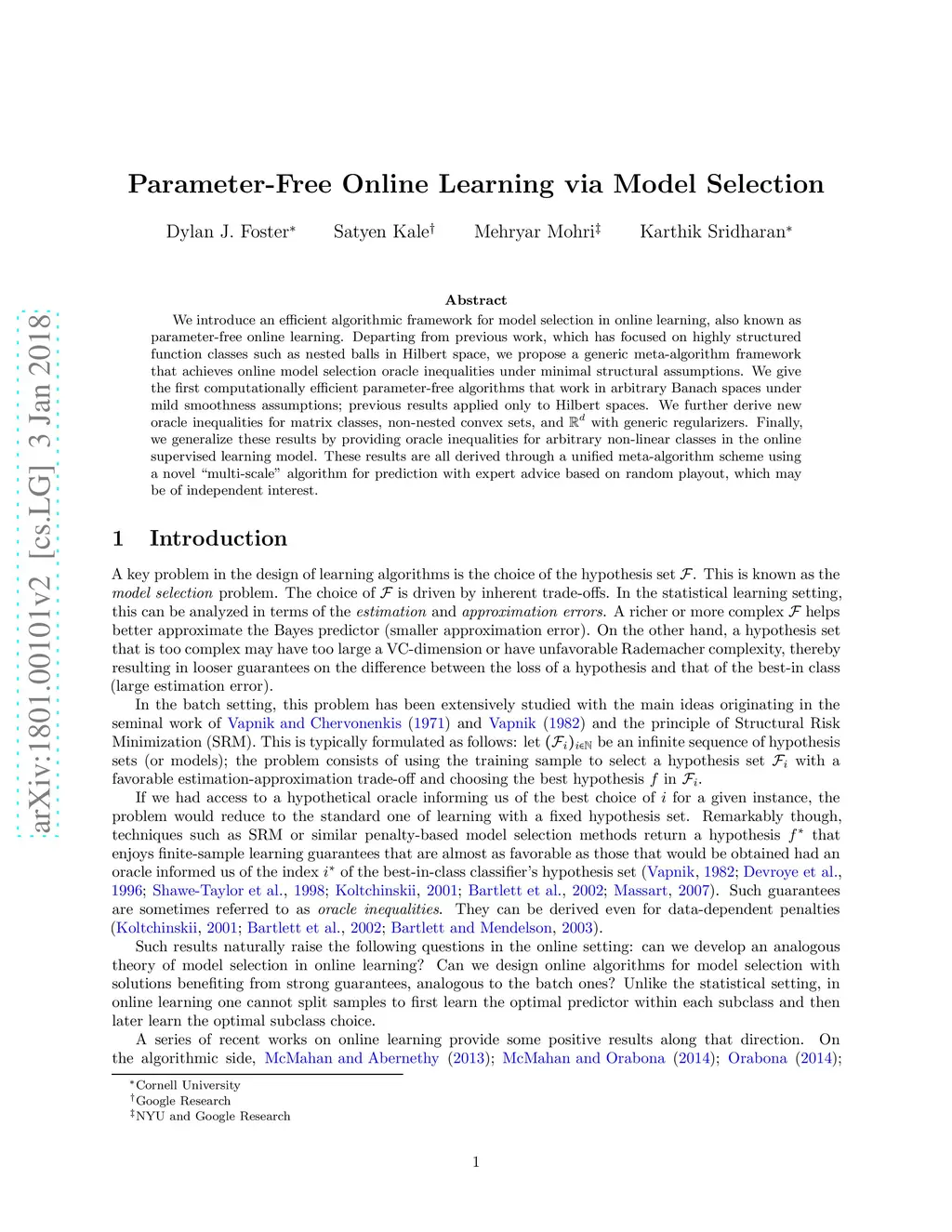 We introduce an efficient algorithmic framework for model selection in online learning, also known as parameter-free online learning. Departing from previous work, which has focused on highly structured function classes such as nested balls in Hilbert space, we propose a generic meta-algorithm framework that achieves online model selection oracle inequalities under minimal structural assumptions. We give the first computationally efficient parameter-free algorithms that work in arbitrary Banach spaces under mild smoothness assumptions; previous results applied only to Hilbert spaces. We further derive new oracle inequalities for matrix classes, non-nested convex sets, and with generic regularizers. Finally, we generalize these results by providing oracle inequalities for arbitrary non-linear classes in the online supervised learning model. These results are all derived through a unified meta-algorithm scheme using a novel "multi-scale" algorithm for prediction with expert advice based on random playout, which may be of independent interest.