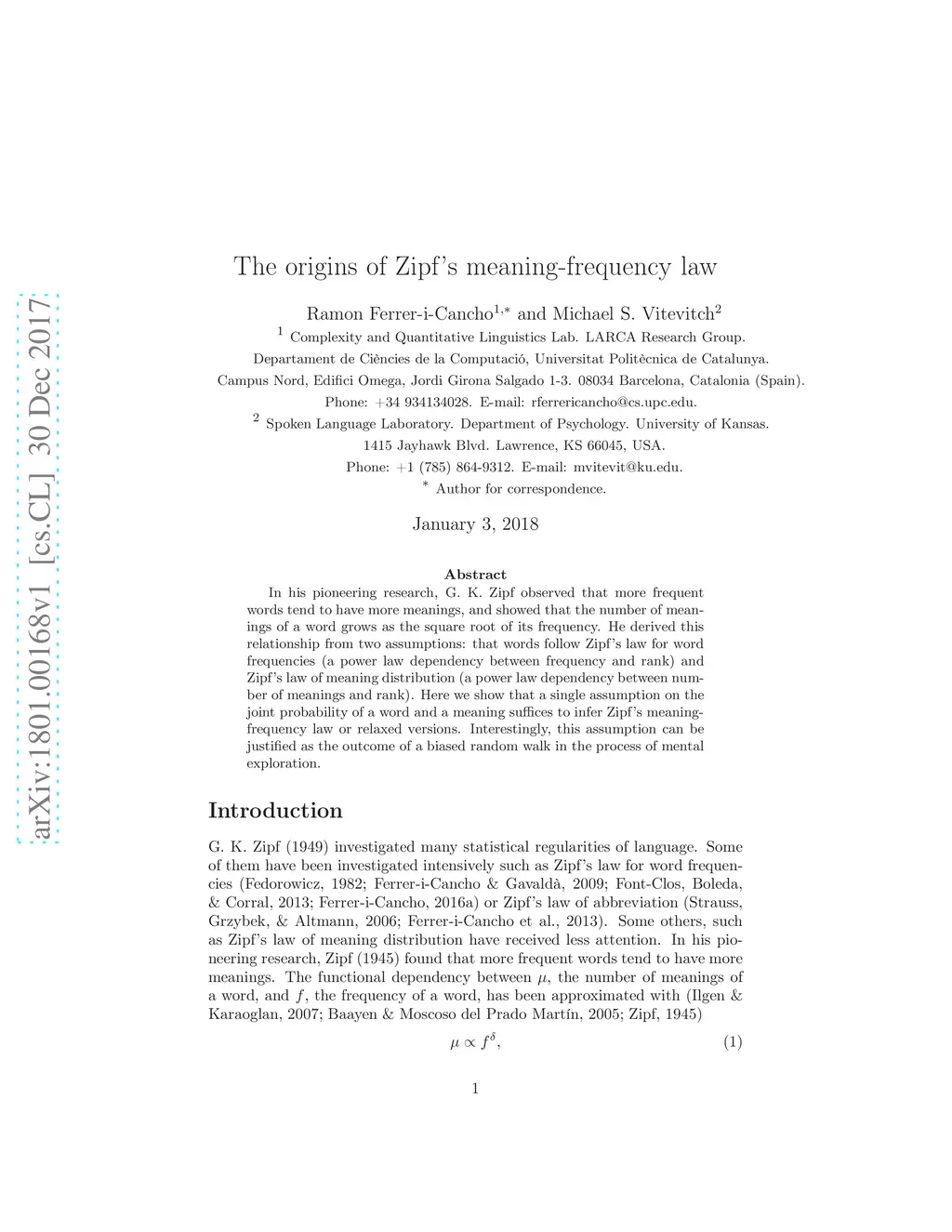 In his pioneering research, G. K. Zipf observed that more frequent words tend to have more meanings, and showed that the number of meanings of a word grows as the square root of its frequency. He derived this relationship from two assumptions: that words follow Zipf's law for word frequencies (a power law dependency between frequency and rank) and Zipf's law of meaning distribution (a power law dependency between number of meanings and rank). Here we show that a single assumption on the joint probability of a word and a meaning suffices to infer Zipf's meaning-frequency law or relaxed versions. Interestingly, this assumption can be justified as the outcome of a biased random walk in the process of mental exploration.