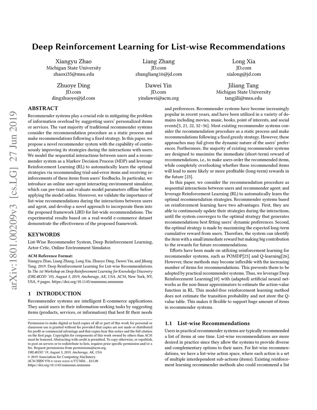 Recommender systems play a crucial role in mitigating the problem of information overload by suggesting users' personalized items or services. The vast majority of traditional recommender systems consider the recommendation procedure as a static process and make recommendations following a fixed strategy. In this paper, we propose a novel recommender system with the capability of continuously improving its strategies during the interactions with users. We model the sequential interactions between users and a recommender system as a Markov Decision Process (MDP) and leverage Reinforcement Learning (RL) to automatically learn the optimal strategies via recommending trial-and-error items and receiving reinforcements of these items from users' feedbacks. In particular, we introduce an online user-agent interacting environment simulator, which can pre-train and evaluate model parameters offline before applying the model online. Moreover, we validate the importance of list-wise recommendations during the interactions between users and agent, and develop a novel approach to incorporate them into the proposed framework LIRD for list-wide recommendations. The experimental results based on a real-world e-commerce dataset demonstrate the effectiveness of the proposed framework.