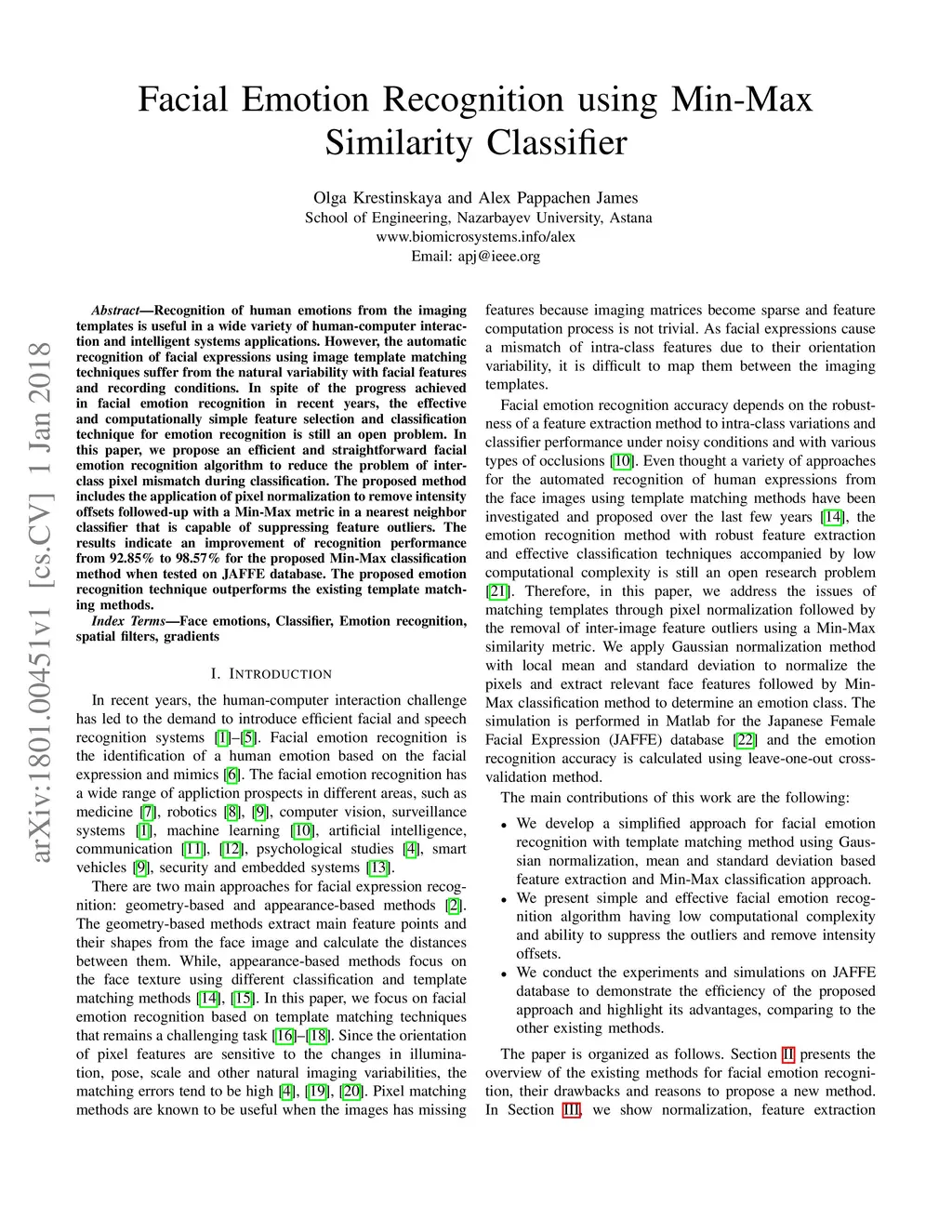 Recognition of human emotions from the imaging templates is useful in a wide variety of human-computer interaction and intelligent systems applications. However, the automatic recognition of facial expressions using image template matching techniques suffer from the natural variability with facial features and recording conditions. In spite of the progress achieved in facial emotion recognition in recent years, the effective and computationally simple feature selection and classification technique for emotion recognition is still an open problem. In this paper, we propose an efficient and straightforward facial emotion recognition algorithm to reduce the problem of inter-class pixel mismatch during classification. The proposed method includes the application of pixel normalization to remove intensity offsets followed-up with a Min-Max metric in a nearest neighbor classifier that is capable of suppressing feature outliers. The results indicate an improvement of recognition performance from 92.85% to 98.57% for the proposed Min-Max classification method when tested on JAFFE database. The proposed emotion recognition technique outperforms the existing template matching methods.