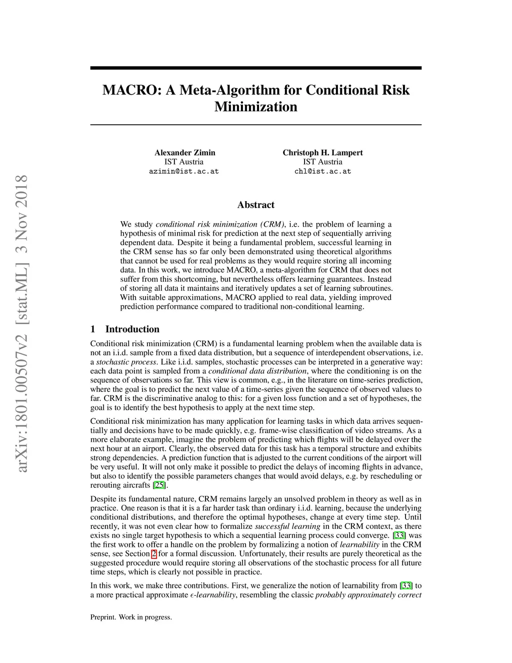 We study conditional risk minimization (CRM), i.e. the problem of learning a hypothesis of minimal risk for prediction at the next step of sequentially arriving dependent data. Despite it being a fundamental problem, successful learning in the CRM sense has so far only been demonstrated using theoretical algorithms that cannot be used for real problems as they would require storing all incoming data. In this work, we introduce MACRO, a meta-algorithm for CRM that does not suffer from this shortcoming, but nevertheless offers learning guarantees. Instead of storing all data it maintains and iteratively updates a set of learning subroutines. With suitable approximations, MACRO applied to real data, yielding improved prediction performance compared to traditional non-conditional learning.