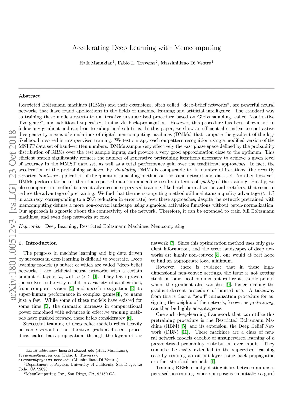 Restricted Boltzmann machines (RBMs) and their extensions, called 'deep-belief networks', are powerful neural networks that have found applications in the fields of machine learning and artificial intelligence. The standard way to training these models resorts to an iterative unsupervised procedure based on Gibbs sampling, called 'contrastive divergence' (CD), and additional supervised tuning via back-propagation. However, this procedure has been shown not to follow any gradient and can lead to suboptimal solutions. In this paper, we show an efficient alternative to CD by means of simulations of digital memcomputing machines (DMMs). We test our approach on pattern recognition using a modified version of the MNIST data set. DMMs sample effectively the vast phase space given by the model distribution of the RBM, and provide a very good approximation close to the optimum. This efficient search significantly reduces the number of pretraining iterations necessary to achieve a given level of accuracy, as well as a total performance gain over CD. In fact, the acceleration of pretraining achieved by simulating DMMs is comparable to, in number of iterations, the recently reported hardware application of the quantum annealing method on the same network and data set. Notably, however, DMMs perform far better than the reported quantum annealing results in terms of quality of the training. We also compare our method to advances in supervised training, like batch-normalization and rectifiers, that work to reduce the advantage of pretraining. We find that the memcomputing method still maintains a quality advantage ( in accuracy, and a reduction in error rate) over these approaches. Furthermore, our method is agnostic about the connectivity of the network. Therefore, it can be extended to train full Boltzmann machines, and even deep networks at once.