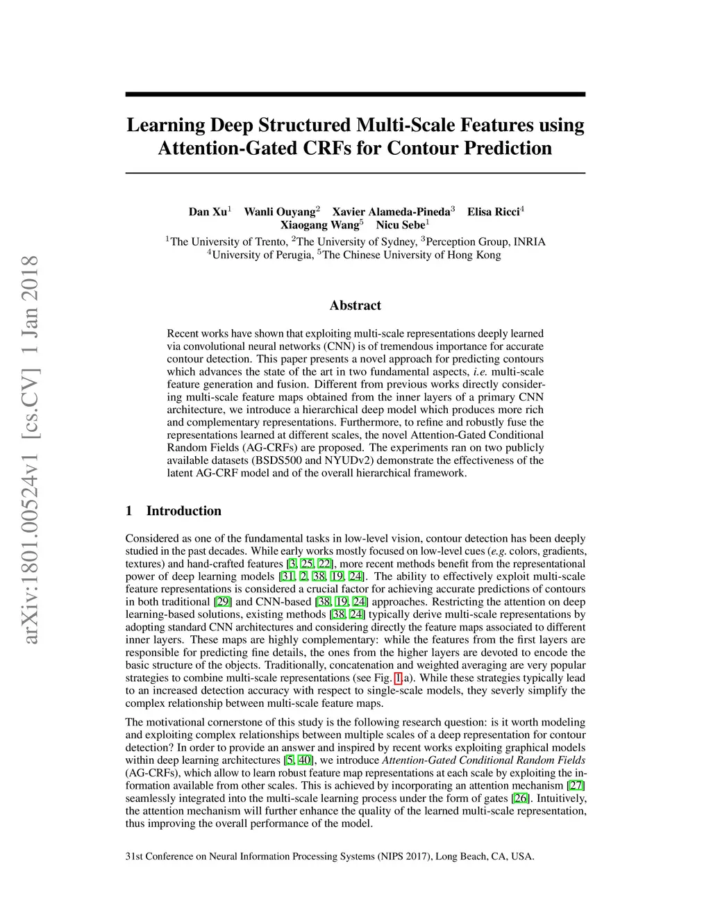 Recent works have shown that exploiting multi-scale representations deeply learned via convolutional neural networks (CNN) is of tremendous importance for accurate contour detection. This paper presents a novel approach for predicting contours which advances the state of the art in two fundamental aspects, i.e. multi-scale feature generation and fusion. Different from previous works directly consider- ing multi-scale feature maps obtained from the inner layers of a primary CNN architecture, we introduce a hierarchical deep model which produces more rich and complementary representations. Furthermore, to refine and robustly fuse the representations learned at different scales, the novel Attention-Gated Conditional Random Fields (AG-CRFs) are proposed. The experiments ran on two publicly available datasets (BSDS500 and NYUDv2) demonstrate the effectiveness of the latent AG-CRF model and of the overall hierarchical framework.