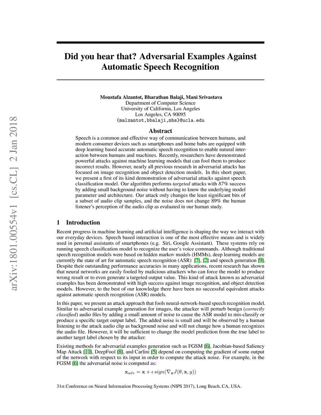 Speech is a common and effective way of communication between humans, and modern consumer devices such as smartphones and home hubs are equipped with deep learning based accurate automatic speech recognition to enable natural interaction between humans and machines. Recently, researchers have demonstrated powerful attacks against machine learning models that can fool them to produceincorrect results. However, nearly all previous research in adversarial attacks has focused on image recognition and object detection models. In this short paper, we present a first of its kind demonstration of adversarial attacks against speech classification model. Our algorithm performs targeted attacks with 87% success by adding small background noise without having to know the underlying model parameter and architecture. Our attack only changes the least significant bits of a subset of audio clip samples, and the noise does not change 89% the human listener's perception of the audio clip as evaluated in our human study.