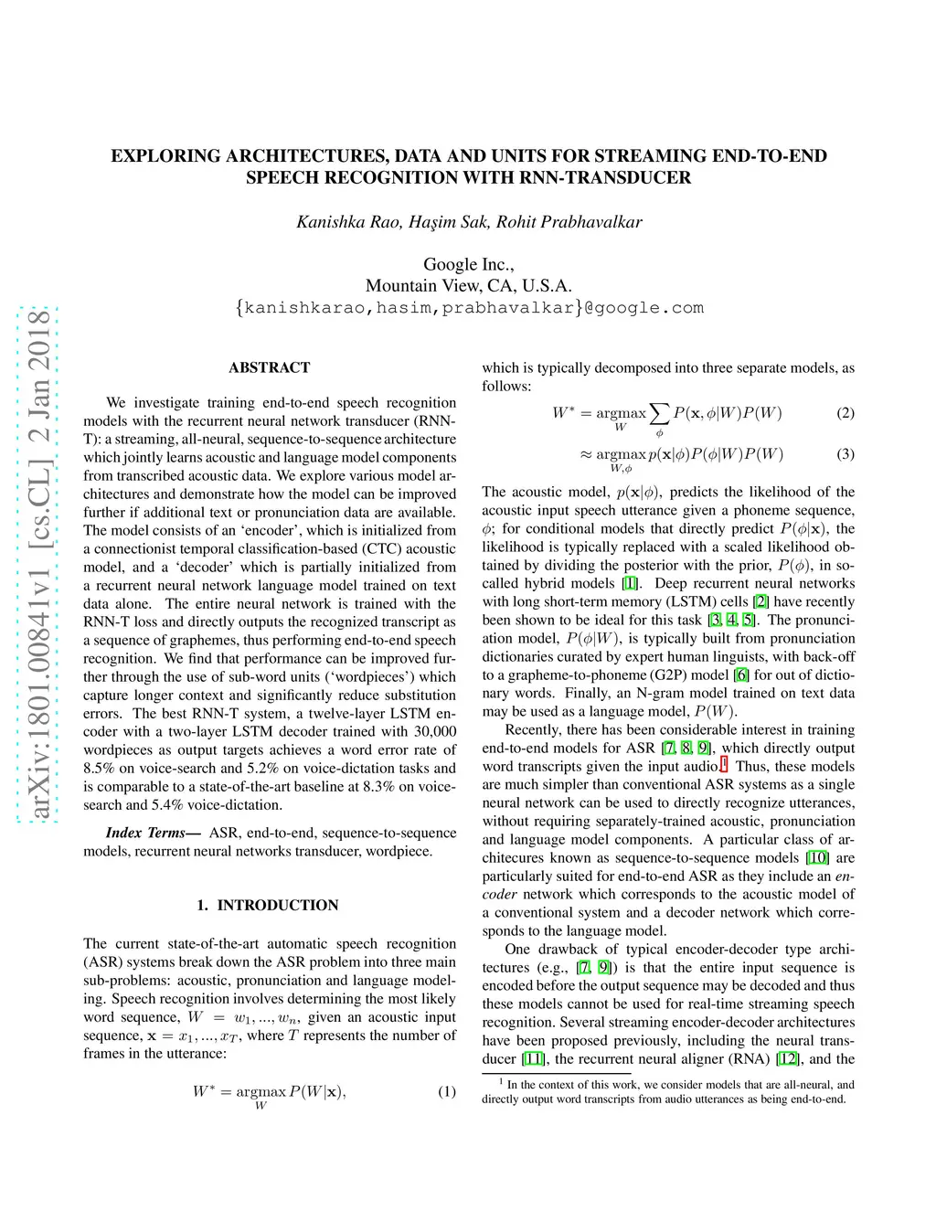 We investigate training end-to-end speech recognition models with the recurrent neural network transducer (RNN-T): a streaming, all-neural, sequence-to-sequence architecture which jointly learns acoustic and language model components from transcribed acoustic data. We explore various model architectures and demonstrate how the model can be improved further if additional text or pronunciation data are available. The model consists of an `encoder', which is initialized from a connectionist temporal classification-based (CTC) acoustic model, and a `decoder' which is partially initialized from a recurrent neural network language model trained on text data alone. The entire neural network is trained with the RNN-T loss and directly outputs the recognized transcript as a sequence of graphemes, thus performing end-to-end speech recognition. We find that performance can be improved further through the use of sub-word units (`wordpieces') which capture longer context and significantly reduce substitution errors. The best RNN-T system, a twelve-layer LSTM encoder with a two-layer LSTM decoder trained with 30,000 wordpieces as output targets achieves a word error rate of 8.5\% on voice-search and 5.2\% on voice-dictation tasks and is comparable to a state-of-the-art baseline at 8.3\% on voice-search and 5.4\% voice-dictation.