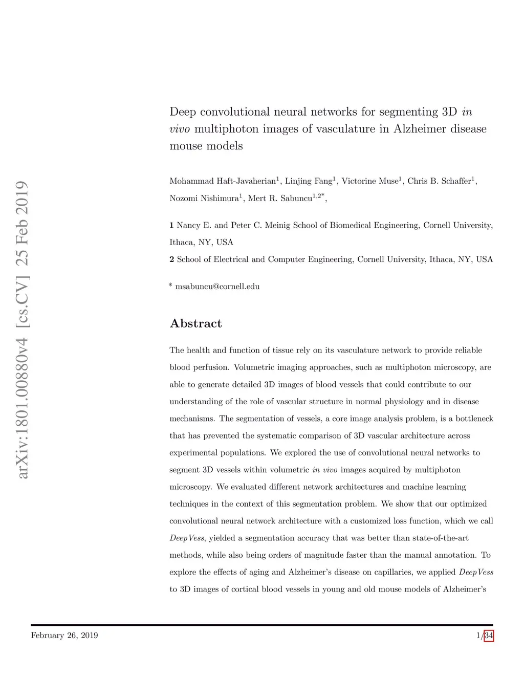The health and function of tissue rely on its vasculature network to provide reliable blood perfusion. Volumetric imaging approaches, such as multiphoton microscopy, are able to generate detailed 3D images of blood vessels that could contribute to our understanding of the role of vascular structure in normal physiology and in disease mechanisms. The segmentation of vessels, a core image analysis problem, is a bottleneck that has prevented the systematic comparison of 3D vascular architecture across experimental populations. We explored the use of convolutional neural networks to segment 3D vessels within volumetric in vivo images acquired by multiphoton microscopy. We evaluated different network architectures and machine learning techniques in the context of this segmentation problem. We show that our optimized convolutional neural network architecture, which we call DeepVess, yielded a segmentation accuracy that was better than both the current state-of-the-art and a trained human annotator, while also being orders of magnitude faster. To explore the effects of aging and Alzheimer's disease on capillaries, we applied DeepVess to 3D images of cortical blood vessels in young and old mouse models of Alzheimer's disease and wild type littermates. We found little difference in the distribution of capillary diameter or tortuosity between these groups, but did note a decrease in the number of longer capillary segments () in aged animals as compared to young, in both wild type and Alzheimer's disease mouse models.