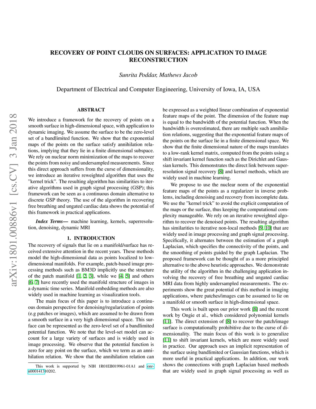 We introduce a framework for the recovery of points on a smooth surface in high-dimensional space, with application to dynamic imaging. We assume the surface to be the zero-level set of a bandlimited function. We show that the exponential maps of the points on the surface satisfy annihilation relations, implying that they lie in a finite dimensional subspace. We rely on nuclear norm minimization of the maps to recover the points from noisy and undersampled measurements. Since this direct approach suffers from the curse of dimensionality, we introduce an iterative reweighted algorithm that uses the "kernel trick". The resulting algorithm has similarities to iterative algorithms used in graph signal processing (GSP); this framework can be seen as a continuous domain alternative to discrete GSP theory. The use of the algorithm in recovering free breathing and ungated cardiac data shows the potential of this framework in practical applications.