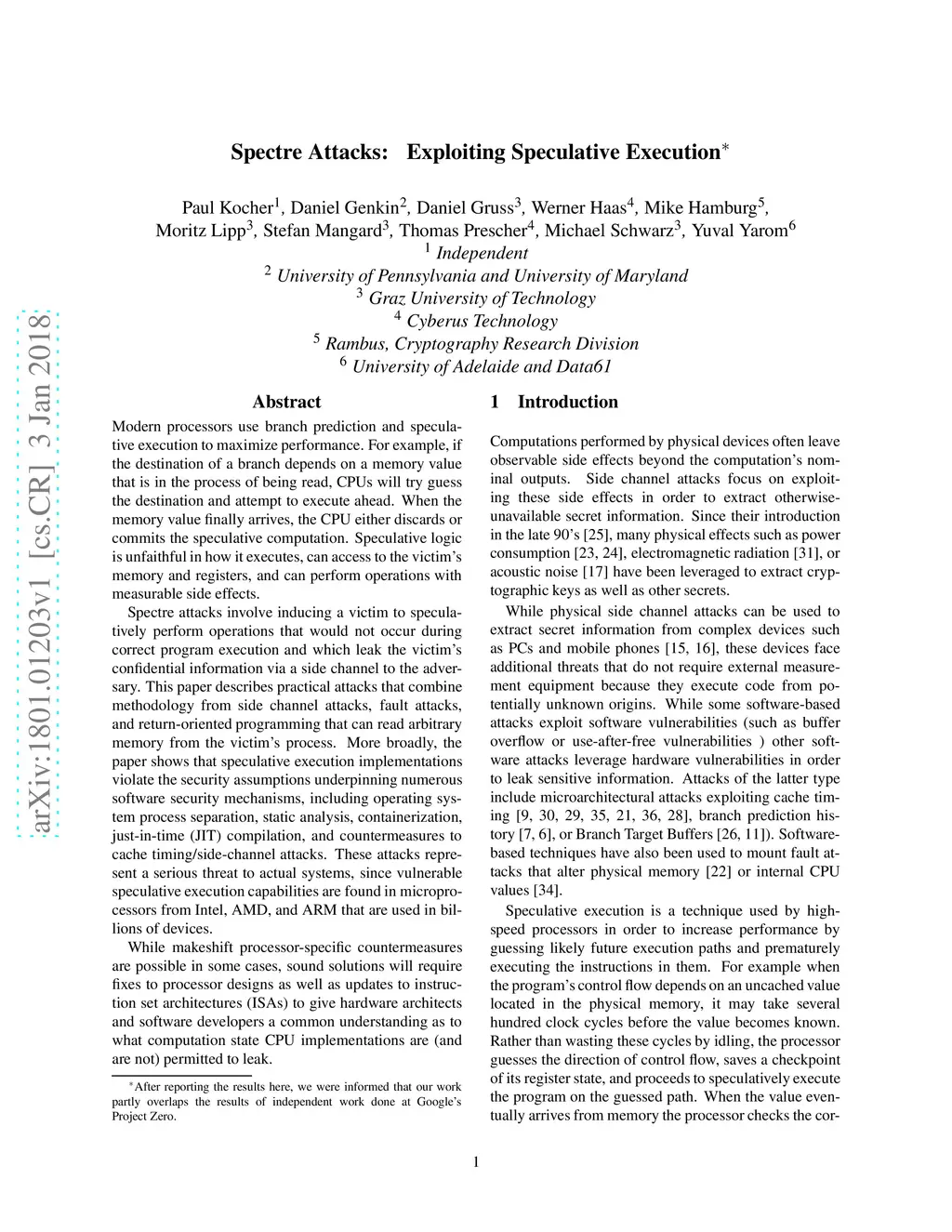 Modern processors use branch prediction and speculative execution to maximize performance. For example, if the destination of a branch depends on a memory value that is in the process of being read, CPUs will try guess the destination and attempt to execute ahead. When the memory value finally arrives, the CPU either discards or commits the speculative computation. Speculative logic is unfaithful in how it executes, can access to the victim's memory and registers, and can perform operations with measurable side effects. Spectre attacks involve inducing a victim to speculatively perform operations that would not occur during correct program execution and which leak the victim's confidential information via a side channel to the adversary. This paper describes practical attacks that combine methodology from side channel attacks, fault attacks, and return-oriented programming that can read arbitrary memory from the victim's process. More broadly, the paper shows that speculative execution implementations violate the security assumptions underpinning numerous software security mechanisms, including operating system process separation, static analysis, containerization, just-in-time (JIT) compilation, and countermeasures to cache timing/side-channel attacks. These attacks represent a serious threat to actual systems, since vulnerable speculative execution capabilities are found in microprocessors from Intel, AMD, and ARM that are used in billions of devices. While makeshift processor-specific countermeasures are possible in some cases, sound solutions will require fixes to processor designs as well as updates to instruction set architectures (ISAs) to give hardware architects and software developers a common understanding as to what computation state CPU implementations are (and are not) permitted to leak.
