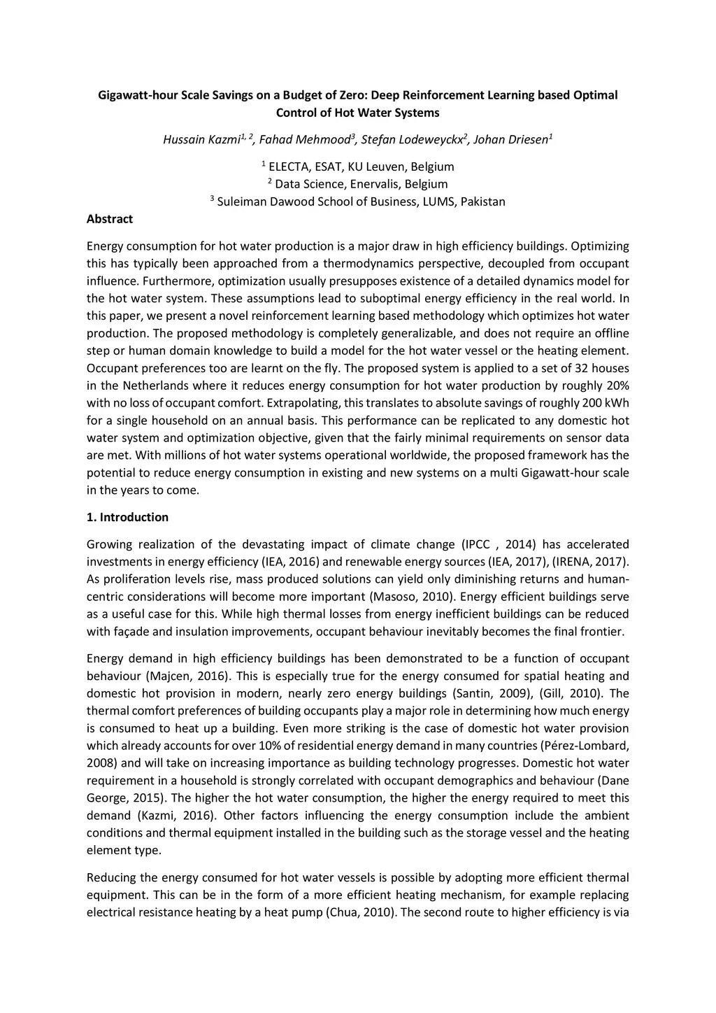 Energy consumption for hot water production is a major draw in high efficiency buildings. Optimizing this has typically been approached from a thermodynamics perspective, decoupled from occupant influence. Furthermore, optimization usually presupposes existence of a detailed dynamics model for the hot water system. These assumptions lead to suboptimal energy efficiency in the real world. In this paper, we present a novel reinforcement learning based methodology which optimizes hot water production. The proposed methodology is completely generalizable, and does not require an offline step or human domain knowledge to build a model for the hot water vessel or the heating element. Occupant preferences too are learnt on the fly. The proposed system is applied to a set of 32 houses in the Netherlands where it reduces energy consumption for hot water production by roughly 20% with no loss of occupant comfort. Extrapolating, this translates to absolute savings of roughly 200 kWh for a single household on an annual basis. This performance can be replicated to any domestic hot water system and optimization objective, given that the fairly minimal requirements on sensor data are met. With millions of hot water systems operational worldwide, the proposed framework has the potential to reduce energy consumption in existing and new systems on a multi Gigawatt-hour scale in the years to come.