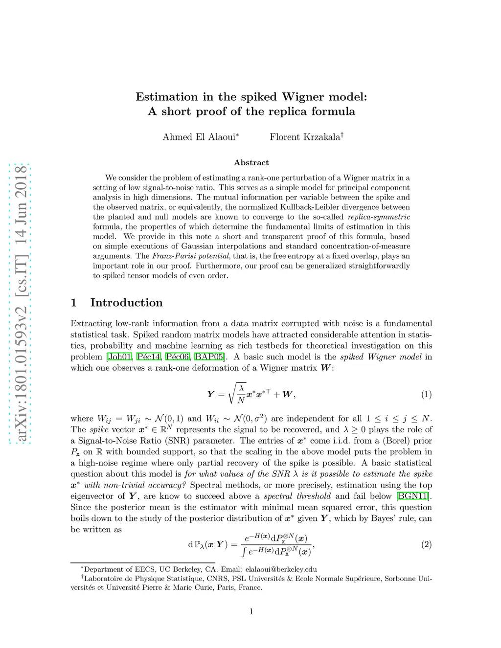 We consider the problem of estimating a rank-one perturbation of a Wigner matrix in a setting of low signal-to-noise ratio. This serves as a simple model for principal component analysis in high dimensions. The mutual information per variable between the spike and the observed matrix, or equivalently, the normalized Kullback-Leibler divergence between the planted and null models are known to converge to the so-called {\em replica-symmetric} formula, the properties of which determine the fundamental limits of estimation in this model. We provide in this note a short and transparent proof of this formula, based on simple executions of Gaussian interpolations and standard concentration-of-measure arguments. The \emph{Franz-Parisi potential}, that is, the free entropy at a fixed overlap, plays an important role in our proof. Furthermore, our proof can be generalized straightforwardly to spiked tensor models of even order.