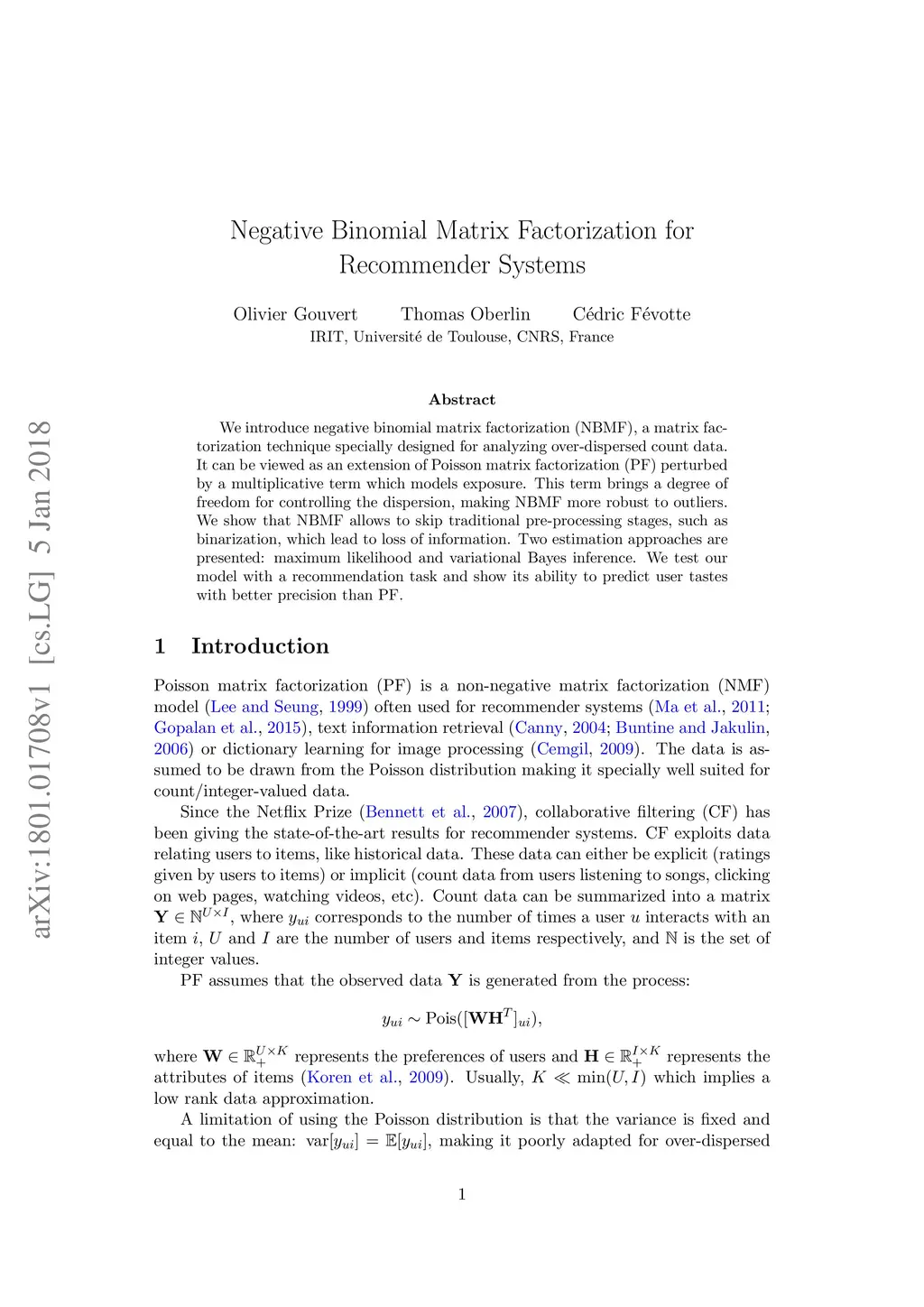 We introduce negative binomial matrix factorization (NBMF), a matrix factorization technique specially designed for analyzing over-dispersed count data. It can be viewed as an extension of Poisson matrix factorization (PF) perturbed by a multiplicative term which models exposure. This term brings a degree of freedom for controlling the dispersion, making NBMF more robust to outliers. We show that NBMF allows to skip traditional pre-processing stages, such as binarization, which lead to loss of information. Two estimation approaches are presented: maximum likelihood and variational Bayes inference. We test our model with a recommendation task and show its ability to predict user tastes with better precision than PF.