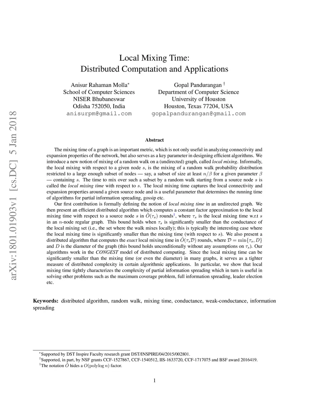 The mixing time of a graph is an important metric, which is not only useful in analyzing connectivity and expansion properties of the network, but also serves as a key parameter in designing efficient algorithms. We introduce a new notion of mixing of a random walk on a (undirected) graph, called local mixing. Informally, the local mixing with respect to a given node , is the mixing of a random walk probability distribution restricted to a large enough subset of nodes --- say, a subset of size at least for a given parameter --- containing . The time to mix over such a subset by a random walk starting from a source node is called the local mixing time with respect to . The local mixing time captures the local connectivity and expansion properties around a given source node and is a useful parameter that determines the running time of algorithms for partial information spreading, gossip etc. Our first contribution is formally defining the notion of local mixing time in an undirected graph. We then present an efficient distributed algorithm which computes a constant factor approximation to the local mixing time with respect to a source node in rounds, where is the local mixing time w.r.t in an -node regular graph. This bound holds when is significantly smaller than the conductance of the local mixing set (i.e., the set where the walk mixes locally); this is typically the interesting case where the local mixing time is significantly smaller than the mixing time (with respect to ). We also present a distributed algorithm that computes the exact local mixing time in rounds, where and is the diameter of the graph. We further show that local mixing time tightly characterizes the complexity of partial information spreading.