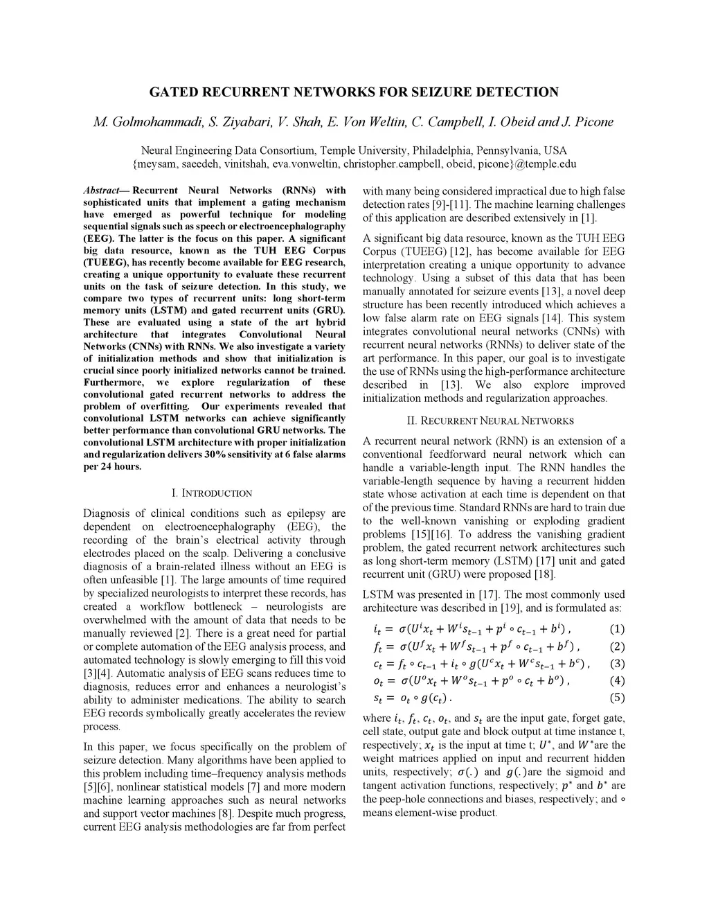Recurrent Neural Networks (RNNs) with sophisticated units that implement a gating mechanism have emerged as powerful technique for modeling sequential signals such as speech or electroencephalography (EEG). The latter is the focus on this paper. A significant big data resource, known as the TUH EEG Corpus (TUEEG), has recently become available for EEG research, creating a unique opportunity to evaluate these recurrent units on the task of seizure detection. In this study, we compare two types of recurrent units: long short-term memory units (LSTM) and gated recurrent units (GRU). These are evaluated using a state of the art hybrid architecture that integrates Convolutional Neural Networks (CNNs) with RNNs. We also investigate a variety of initialization methods and show that initialization is crucial since poorly initialized networks cannot be trained. Furthermore, we explore regularization of these convolutional gated recurrent networks to address the problem of overfitting. Our experiments revealed that convolutional LSTM networks can achieve significantly better performance than convolutional GRU networks. The convolutional LSTM architecture with proper initialization and regularization delivers 30% sensitivity at 6 false alarms per 24 hours.