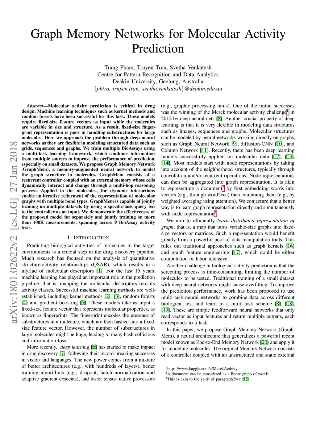 Molecular activity prediction is critical in drug design. Machine learning techniques such as kernel methods and random forests have been successful for this task. These models require fixed-size feature vectors as input while the molecules are variable in size and structure. As a result, fixed-size fingerprint representation is poor in handling substructures for large molecules. In addition, molecular activity tests, or a so-called BioAssays, are relatively small in the number of tested molecules due to its complexity. Here we approach the problem through deep neural networks as they are flexible in modeling structured data such as grids, sequences and graphs. We train multiple BioAssays using a multi-task learning framework, which combines information from multiple sources to improve the performance of prediction, especially on small datasets. We propose Graph Memory Network (GraphMem), a memory-augmented neural network to model the graph structure in molecules. GraphMem consists of a recurrent controller coupled with an external memory whose cells dynamically interact and change through a multi-hop reasoning process. Applied to the molecules, the dynamic interactions enable an iterative refinement of the representation of molecular graphs with multiple bond types. GraphMem is capable of jointly training on multiple datasets by using a specific-task query fed to the controller as an input. We demonstrate the effectiveness of the proposed model for separately and jointly training on more than 100K measurements, spanning across 9 BioAssay activity tests.