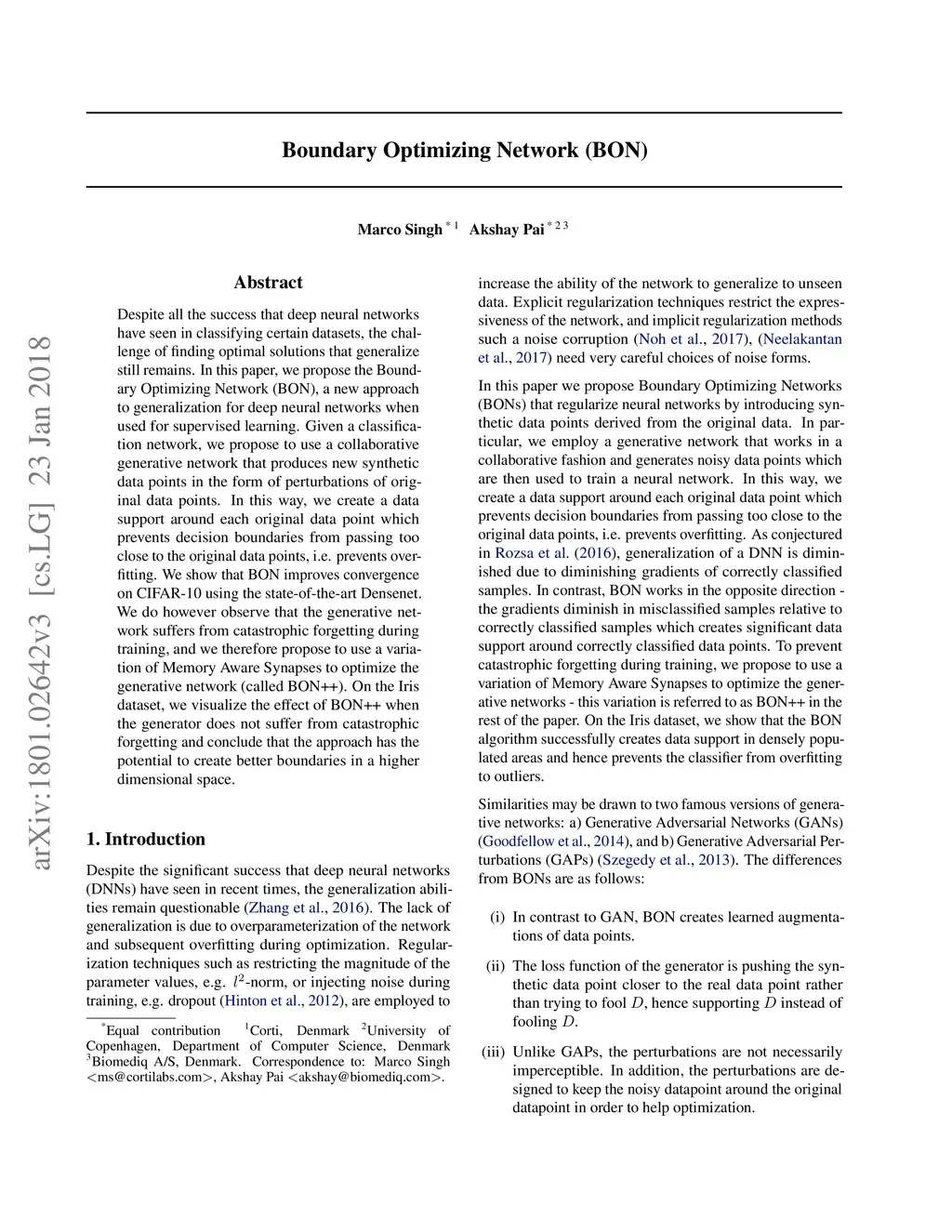 Despite all the success that deep neural networks have seen in classifying certain datasets, the challenge of finding optimal solutions that generalize still remains. In this paper, we propose the Boundary Optimizing Network (BON), a new approach to generalization for deep neural networks when used for supervised learning. Given a classification network, we propose to use a collaborative generative network that produces new synthetic data points in the form of perturbations of original data points. In this way, we create a data support around each original data point which prevents decision boundaries from passing too close to the original data points, i.e. prevents overfitting. We show that BON improves convergence on CIFAR-10 using the state-of-the-art Densenet. We do however observe that the generative network suffers from catastrophic forgetting during training, and we therefore propose to use a variation of Memory Aware Synapses to optimize the generative network (called BON++). On the Iris dataset, we visualize the effect of BON++ when the generator does not suffer from catastrophic forgetting and conclude that the approach has the potential to create better boundaries in a higher dimensional space.