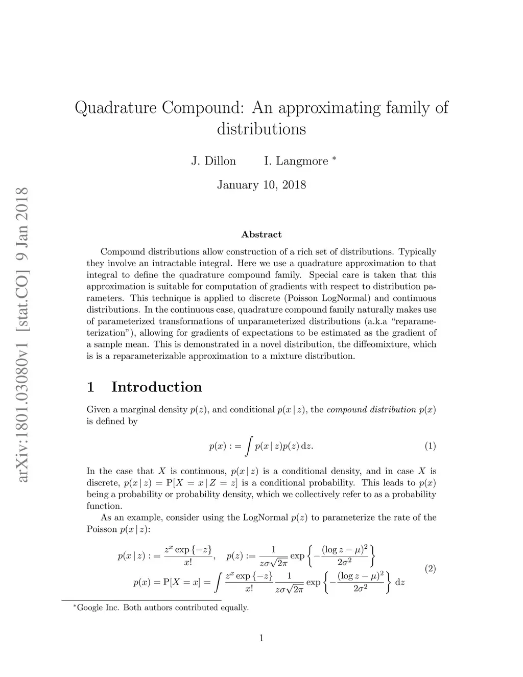 Compound distributions allow construction of a rich set of distributions. Typically they involve an intractable integral. Here we use a quadrature approximation to that integral to define the quadrature compound family. Special care is taken that this approximation is suitable for computation of gradients with respect to distribution parameters. This technique is applied to discrete (Poisson LogNormal) and continuous distributions. In the continuous case, quadrature compound family naturally makes use of parameterized transformations of unparameterized distributions (a.k.a "reparameterization"), allowing for gradients of expectations to be estimated as the gradient of a sample mean. This is demonstrated in a novel distribution, the diffeomixture, which is is a reparameterizable approximation to a mixture distribution.
