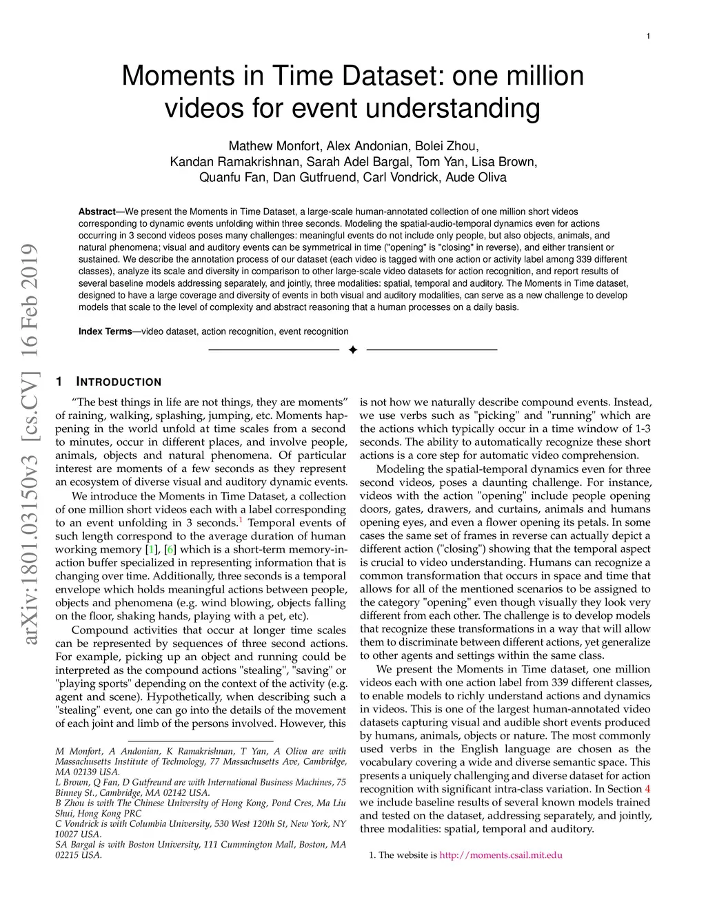 Moments in Time Dataset: one million videos for event understanding
