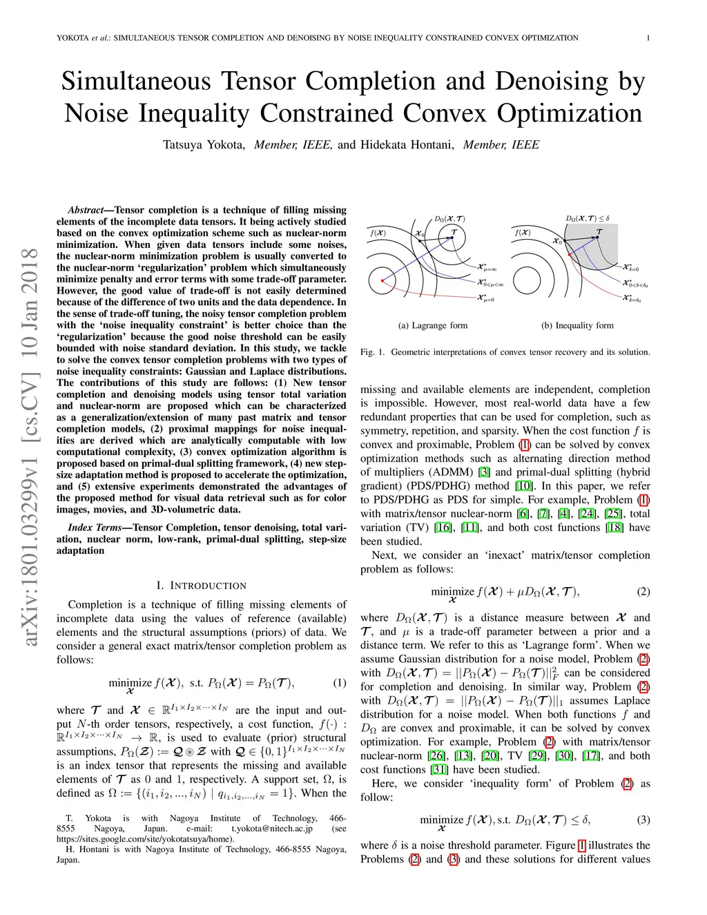 Tensor completion is a technique of filling missing elements of the incomplete data tensors. It being actively studied based on the convex optimization scheme such as nuclear-norm minimization. When given data tensors include some noises, the nuclear-norm minimization problem is usually converted to the nuclear-norm `regularization' problem which simultaneously minimize penalty and error terms with some trade-off parameter. However, the good value of trade-off is not easily determined because of the difference of two units and the data dependence. In the sense of trade-off tuning, the noisy tensor completion problem with the `noise inequality constraint' is better choice than the `regularization' because the good noise threshold can be easily bounded with noise standard deviation. In this study, we tackle to solve the convex tensor completion problems with two types of noise inequality constraints: Gaussian and Laplace distributions. The contributions of this study are follows: (1) New tensor completion and denoising models using tensor total variation and nuclear-norm are proposed which can be characterized as a generalization/extension of many past matrix and tensor completion models, (2) proximal mappings for noise inequalities are derived which are analytically computable with low computational complexity, (3) convex optimization algorithm is proposed based on primal-dual splitting framework, (4) new step-size adaptation method is proposed to accelerate the optimization, and (5) extensive experiments demonstrated the advantages of the proposed method for visual data retrieval such as for color images, movies, and 3D-volumetric data.