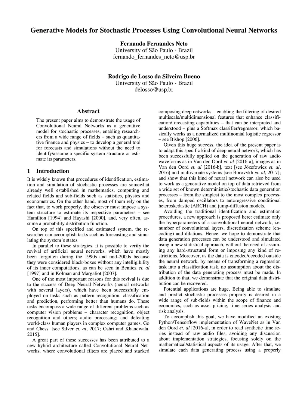 The present paper aims to demonstrate the usage of Convolutional Neural Networks as a generative model for stochastic processes, enabling researchers from a wide range of fields (such as quantitative finance and physics) to develop a general tool for forecasts and simulations without the need to identify/assume a specific system structure or estimate its parameters.